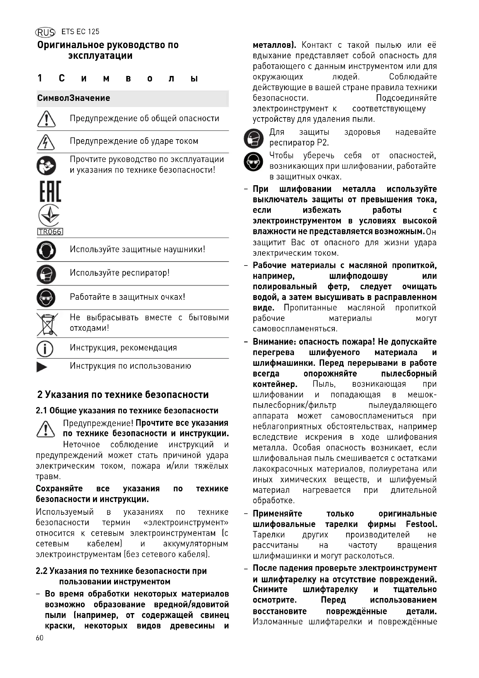 Ano da marca CE:201560 ETS EC 125 RUS Оригинальное руководство по эксплуатации 1Символы 2 Указания по технике безопасности