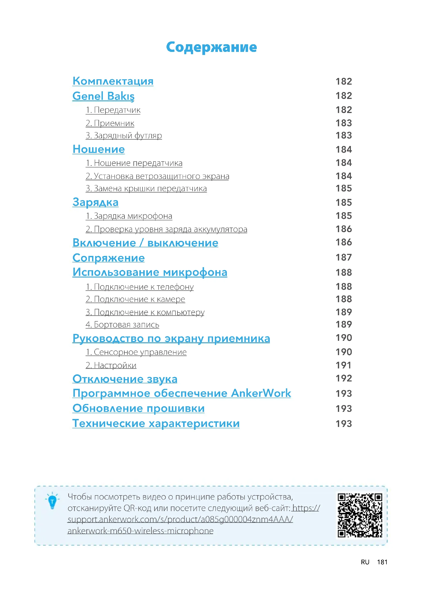 Обновление прошивки Технические характеристики Чтобы посмотреть видео о принципе работы устройства, отсканируйте QR-код или посетите следующий веб-сайт: https:// support.ankerwork.com/s/product/a085g000004znm4AAA/ ankerwork-m650-wireless-microphone