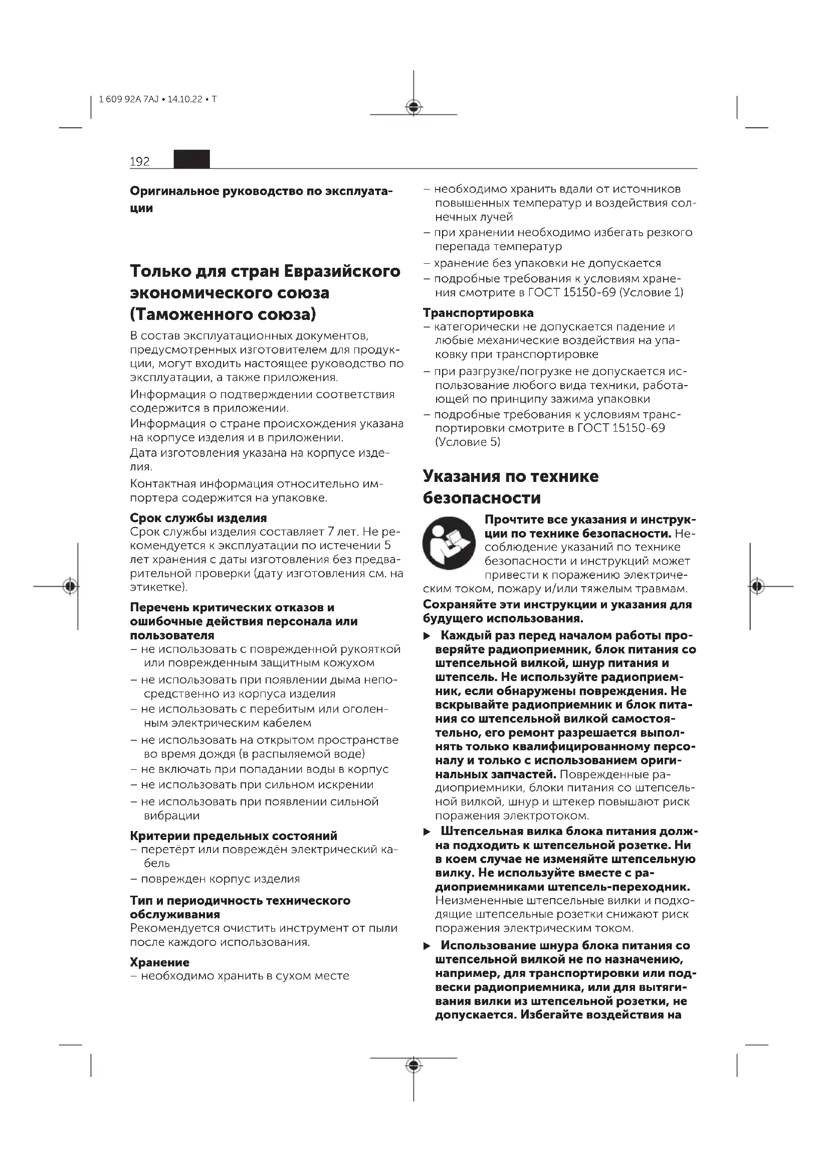 – необходимо хранить в сухом месте – необходимо хранить вдали от источников повышенных температур и воздействия сол- нечных лучей – при хранении необходимо избегать резкого перепада температур – хранение без упаковки не допускается – подробные требования к условиям хране- ния смотрите в ГОСТ15150-69 (Условие1) Транспортировка – категорически не допускается падение и любые механические воздействия на упа- ковку при транспортировке – при разгрузке/погрузке не допускается ис- пользование любого вида техники, работа- ющей по принципу зажима упаковки – подробные требования к условиям транс- портировки смотрите в ГОСТ 15150-69 (Условие 5) Указания по технике безопасностиРусский Прочтите все указания и инструк- ции по технике безопасности. Не- соблюдение указаний по технике безопасности и инструкций может привести к поражению электриче- ским током, пожару и/или тяжелым травмам. Сохраняйте эти инструкции и указания для будущего использования. u Каждый раз перед началом работы про- веряйте радиоприемник, блок питания со штепсельной вилкой, шнур питания и штепсель. Не используйте радиоприем- ник, если обнаружены повреждения. Не вскрывайте радиоприемник и блок пита- ния со штепсельной вилкой самостоя- тельно, его ремонт разрешается выпол- нять только квалифицированному персо- налу и только с использованием ориги- нальных запчастей. Поврежденные ра- диоприемники, блоки питания со штепсель- ной вилкой, шнур и штекер повышают риск поражения электротоком. u Штепсельная вилка блока питания долж- на подходить к штепсельной розетке. Ни в коем случае не изменяйте штепсельную вилку. Не используйте вместе с ра- диоприемниками штепсель-переходник. Неизмененные штепсельные вилки и подхо- дящие штепсельные розетки снижают риск поражения электрическим током. u Использование шнура блока питания со штепсельной вилкой не по назначению, например, для транспортировки или под- вески радиоприемника, или для вытяги- вания вилки из штепсельной розетки, не допускается. Избегайте воздействия на 192 ru 1 609 92A 7AJ • 14.10.22 • Tшнур высоких температур, масла, острых кромок или подвижных частей электроинструмента. Поврежденный или спутанный шнур повышает риск поражения электрическим током. Защищайте радиоприемник и блок питания со штепсельной вилкой от дождя и сырости. Про- никновение воды в радиоприемник или блок питания со штепсельной вилкой повышает риск поражения электрическим током. u Не вскрывайте аккумулятор. При этом возникает опасность короткого замыкания. u При повреждении и ненадлежащем ис- пользовании аккумулятора может выде- литься газ. Аккумулятор может возго- раться или взрываться.Обеспечьте приток свежего воздуха и при возникновении жа- лоб обратитесь к врачу. Газы могут вызвать раздражение дыхательных путей. u При неправильном использовании из ак- кумулятора может потечь жидкость. Из- бегайте соприкосновения с ней. При слу- чайном контакте промойте соответству- ющее место водой. Если эта жидкость попадет в глаза, то дополнительно обра- титесь за помощью к врачу. Вытекающая аккумуляторная жидкость может привести к раздражению кожи или к ожогам. u Острыми предметами, как напр., гвоздем или отверткой, а также внешним сило- вым воздействием можно повредить ак- кумуляторную батарею. Это может при- вести к внутреннему короткому замыканию, возгоранию с з