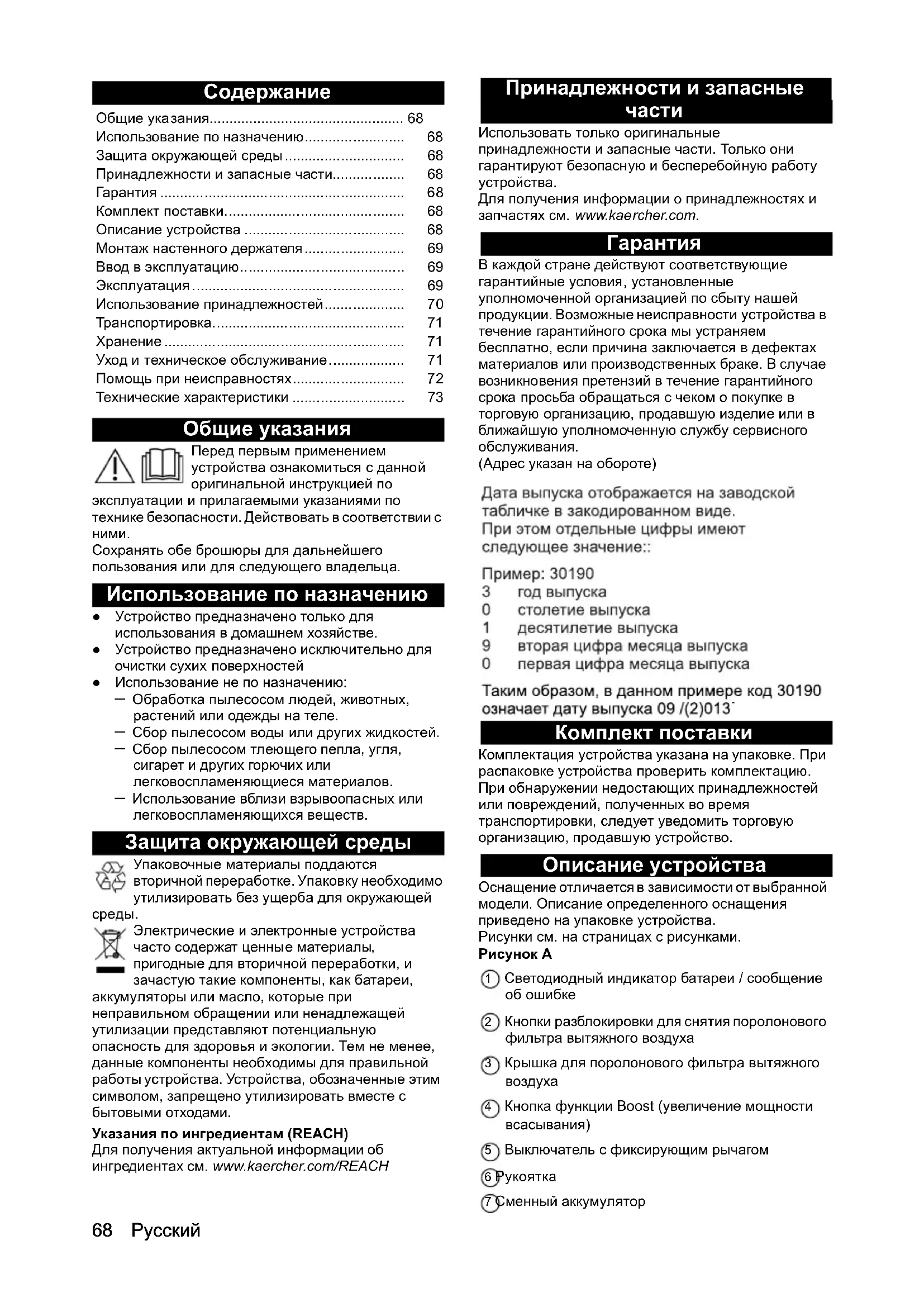 омпоненты необходимы для правильной работы устройства. Устройства, обозначенные этим символом, запрещено утилизировать вместе с бытовыми отходами. Указания по ингредиентам (REACH) Для получения актуальной информации об ингредиентах см. www.kaercher.com/REACH Принадлежности и запасные