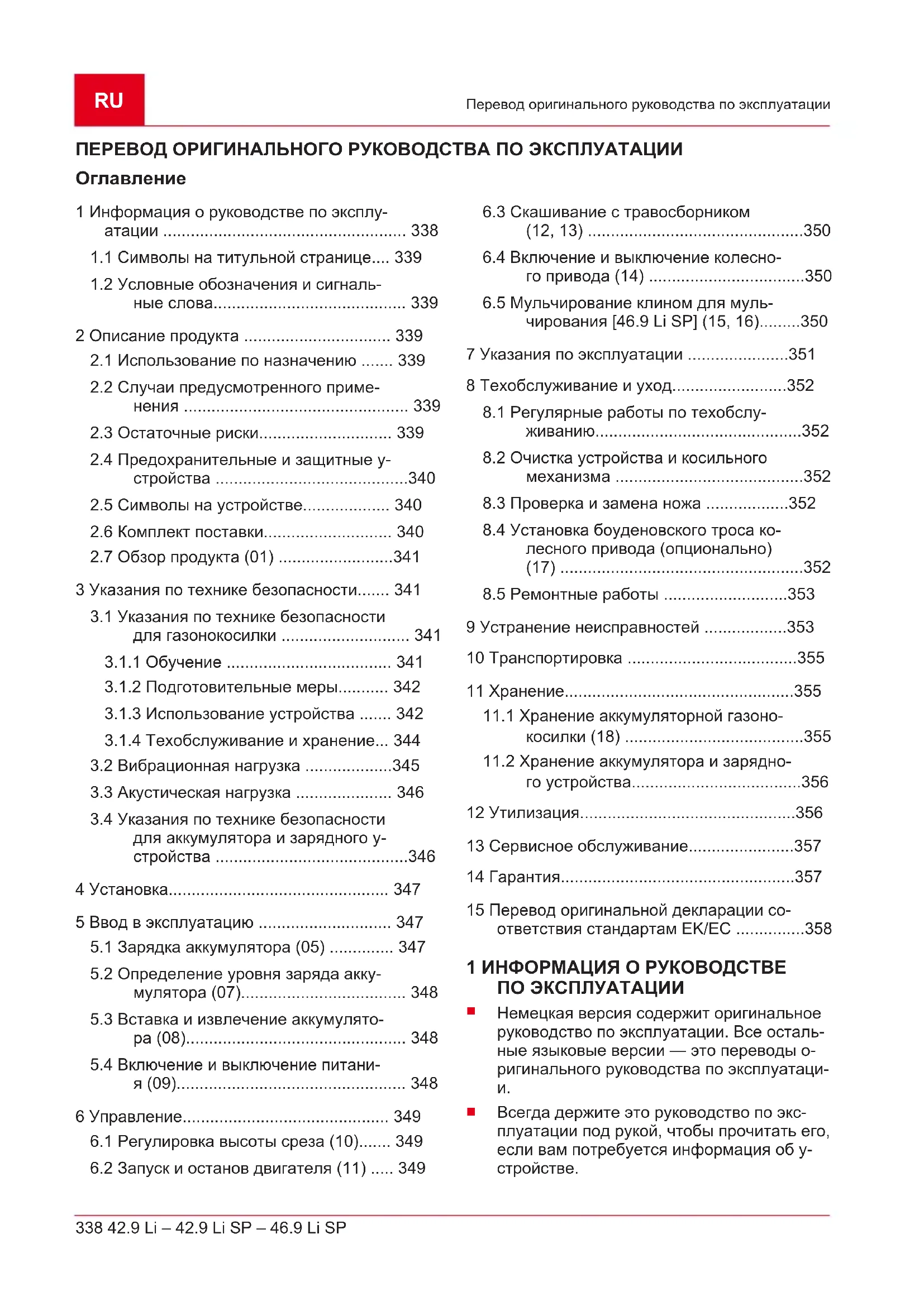 94,2dB(A)/96dB(A)RU 338 42.9 Li – 42.9 Li SP – 46.9 Li SP Перевод оригинального руководства по эксплуатации ПЕРЕВОД ОРИГИНАЛЬНОГО РУКОВОДСТВА ПО ЭКСПЛУАТАЦИИ