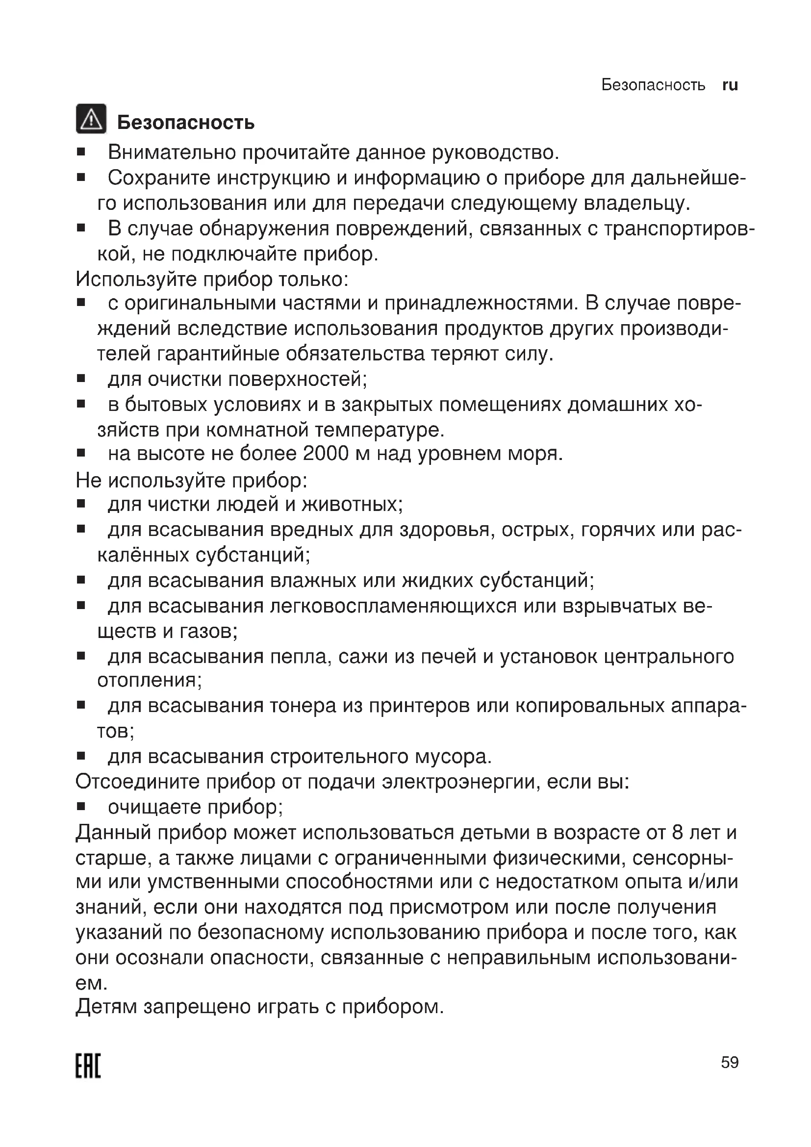 Безопасность ¡ Внимательно прочитайте данное руководство. ¡ Сохраните инструкцию и информацию о приборе для дальнейше- го использования или для передачи следующему владельцу. ¡ В случае обнаружения повреждений, связанных с транспортиров- кой, не подключайте прибор. Используйте прибор только: ¡ с оригинальными частями и принадлежностями. В случае повре- ждений вследствие использования продуктов других производи- телей гарантийные обязательства теряют силу. ¡ для очистки поверхностей; ¡ в бытовых условиях и в закрытых помещениях домашних хо- зяйств при комнатной температуре. ¡ на высоте не более 2000м над уровнем моря. Не используйте прибор: ¡ для чистки людей и животных; ¡ для всасывания вредных для здоровья, острых, горячих или рас- калённых субстанций; ¡ для всасывания влажных или жидких субстанций; ¡ для всасывания легковоспламеняющихся или взрывчатых ве- ществ и газов; ¡ для всасывания пепла, сажи из печей и установок центрального
