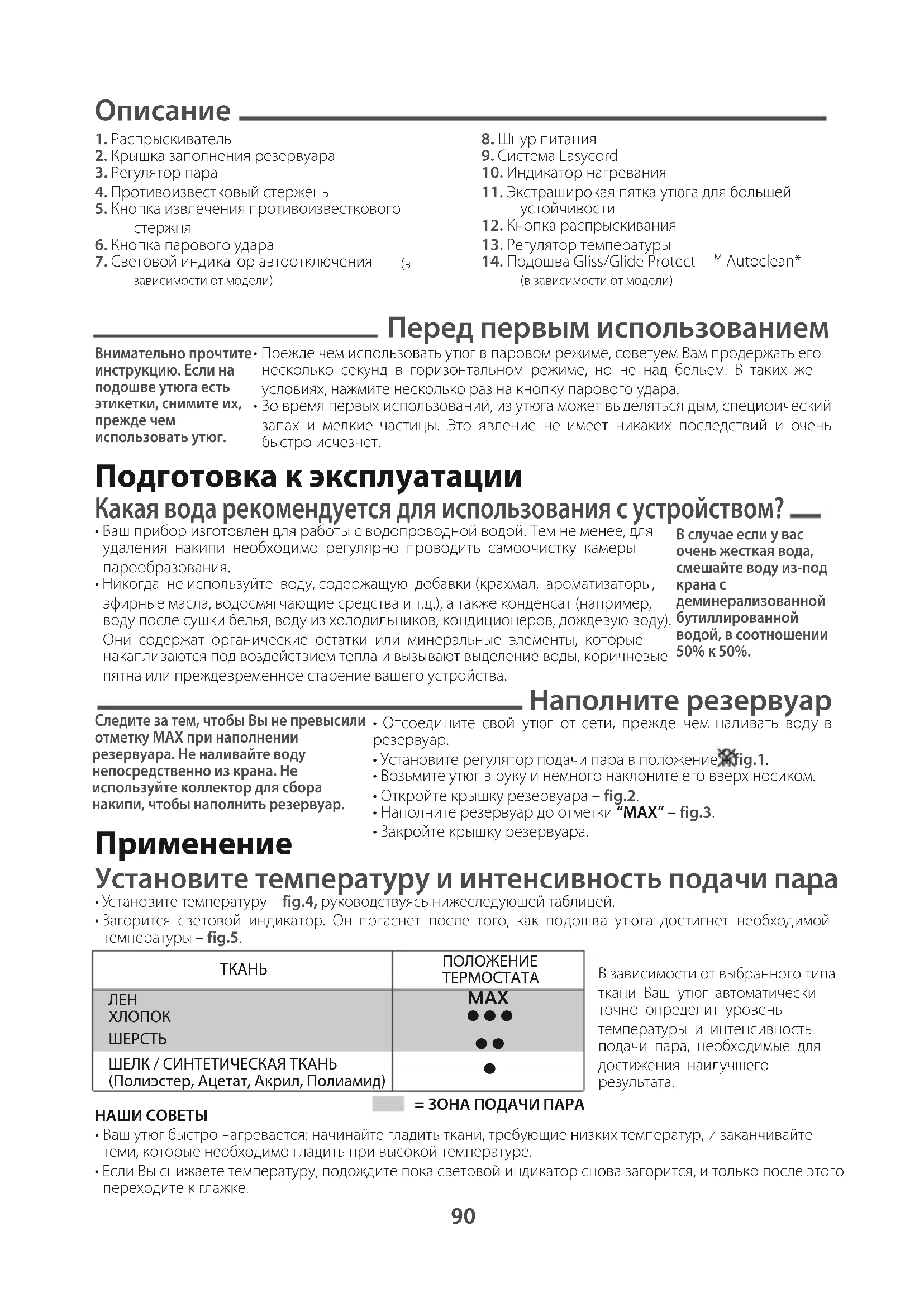 - Установите температуру в зависимости от типа ткани.• Установите указатель температуры отпаривания на – fig.1.• Вы можете начинать гладить после того, как световой индикатор погаснет. Дополнительные функции Самоочищающаяся подошва Gliss/Glide Protect