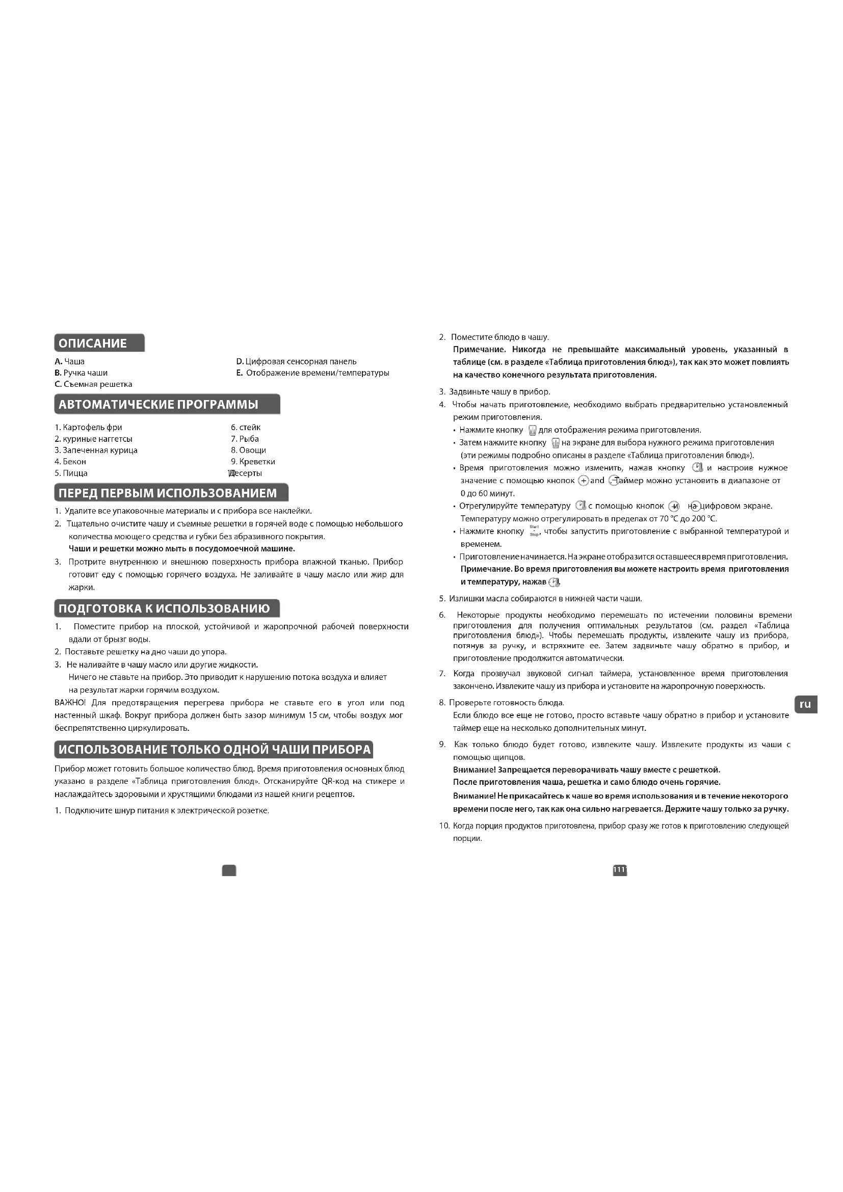 Ничего не ставьте на прибор. Это приводит к нарушению потока воздуха и влияет на результат жарки горячим воздухом. ВАЖНО! Для предотвращения перегрева прибора не ставьте его в угол или под настенный шкаф. Вокруг прибора должен быть зазор минимум 15см, чтобы воздух мог беспрепятственно циркулировать. ИСПОЛЬЗОВАНИЕ ТОЛЬКО ОДНОЙ ЧАШИ ПРИБОРА Прибор может готовить большое количество блюд. Время приготовления основных блюд указано в разделе «Таблица приготовления блюд». Отсканируйте QR-код на стикере и наслаждайтесь здоровыми и хрустящими блюдами из нашей книги рецептов.