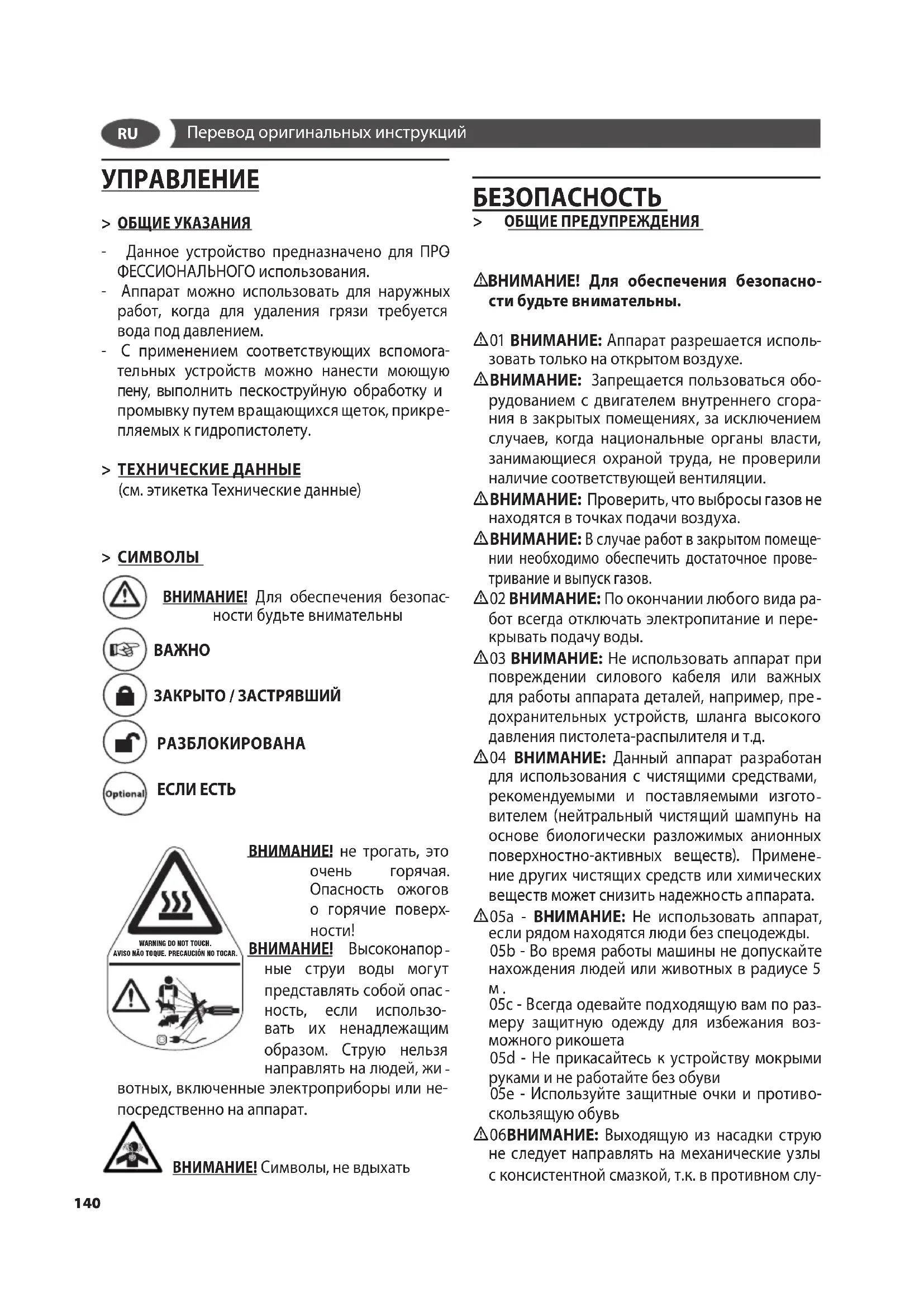 ФЕССИОНАЛЬНОГО использования. - Аппарат можно использовать для наружных работ, когда для удаления грязи требуется вода под давлением. - С применением соответствующих вспомога