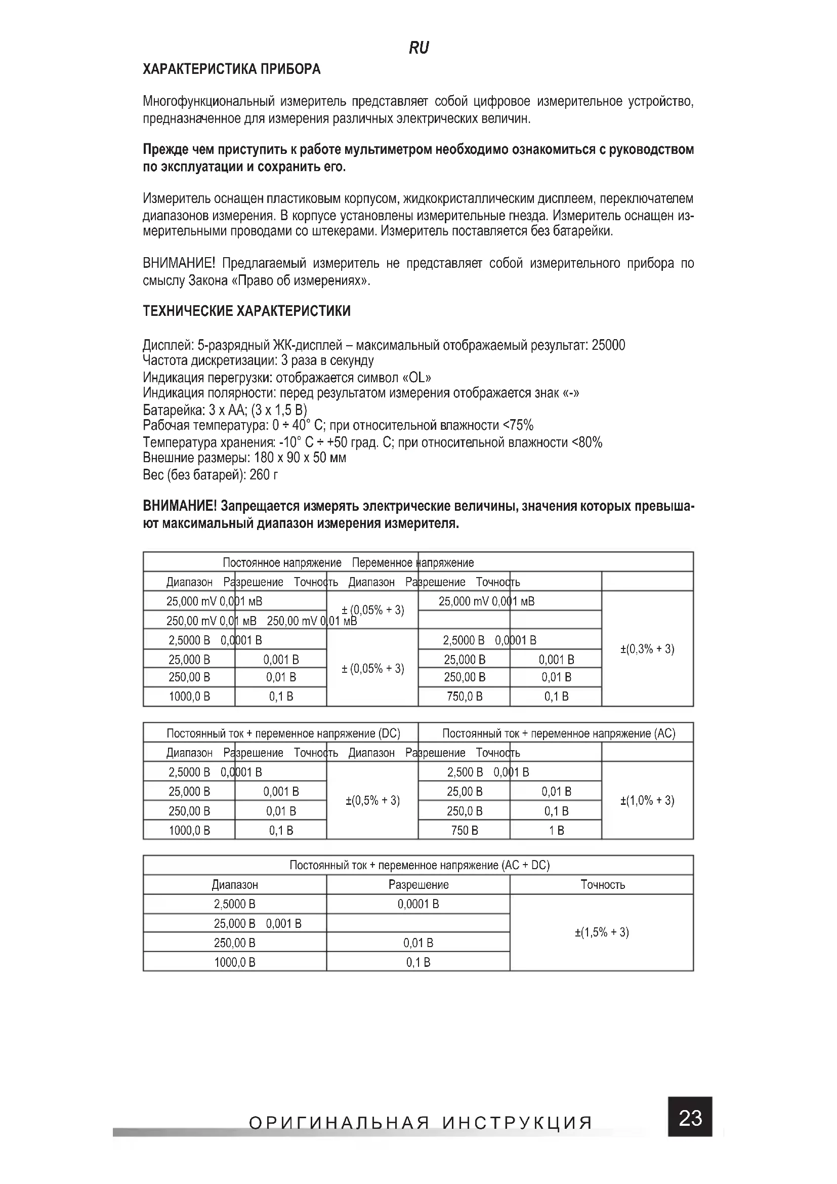 ХАРАКТЕРИСТИКА ПРИБОРА Многофункциональный измеритель представляет собой цифровое измерительное устройство, предназначенное для измерения различных электрических величин. Прежде чем приступить к работе мультиметром необходимо ознакомиться с руководством по эксплуатации и сохранить его. Измеритель оснащен пластиковым корпусом, жидкокристаллическим дисплеем, переключателем диапазонов измерения. В корпусе установлены измерительные гнезда. Измеритель оснащен из- мерительными проводами со штекерами. Измеритель поставляется без батарейки. ВНИМАНИЕ! Предлагаемый измеритель не представляет собой измерительного прибора по смыслу Закона «Право об измерениях». ТЕХНИЧЕСКИЕ ХАРАКТЕРИСТИКИ Дисплей: 5-разрядный ЖК-дисплей – максимальный отображаемый результат: 25000 Частота дискретизации: 3 раза в секунду Индикация перегрузки: отображается символ «OL» Индикация полярности: перед результатом измерения отображается знак «-» Батарейка: 3 x AA; (3 x 1,5 В) Рабочая температура: 0 ÷ 40° C; при относительной влажности <75% Температура хранения : -10° C ÷ +50 град. C; при относительной влажности <80% Внешние размеры: 180 x 90 x 50 мм Вес (без батарей): 260 г ВНИМАНИЕ! Запрещается измерять электрические величины, значения которых превыша- ют максимальный диапазон измерения измерителя. Постоянное напряжение Переменное напряжение Диапазон Разрешение Точность Диапазон Разрешение Точность 25,000 mV 0,001 мВ ± (0,05% + 3) 25,000 mV 0,001 мВ ±(0,3% + 3) 250,00 mV 0,01 мВ 250,00 mV 0,01 мВ 2,5000 В 0,0001 В ± (0,05% + 3) 2,5000 В 0,0001 В 25,000 В 0,001 В 25,000 В 0,001 В 250,00 В 0,01 В 250,00 В 0,01 В 1000,0 В 0,1 В 750,0 В 0,1 В Постоянный ток + переменное напряжение (DC) Постоянный ток + переменное напряжение (AC) Диапазон Разрешение Точность Диапазон Разрешение Точность 2,5000 В 0,0001 В ±(0,5% + 3) 2,500 В 0,001 В ±(1,0% + 3) 25,000 В 0,001 В 25,00 В 0,01 В 250,00 В 0,01 В 250,0 В 0,1 В 1000,0 В 0,1 В 750 В 1 В Постоянный ток + переменное напряжение (AC + DC) Диапазон Разрешение Точность 2,5000 В 0,0001 В ±(1,5% + 3) 25,000 В 0,001 В 250,00 В 0,01 В 1000,0 В 0,1 В24 ОРИГИНАЛЬНАЯ ИНСТРУКЦИЯ