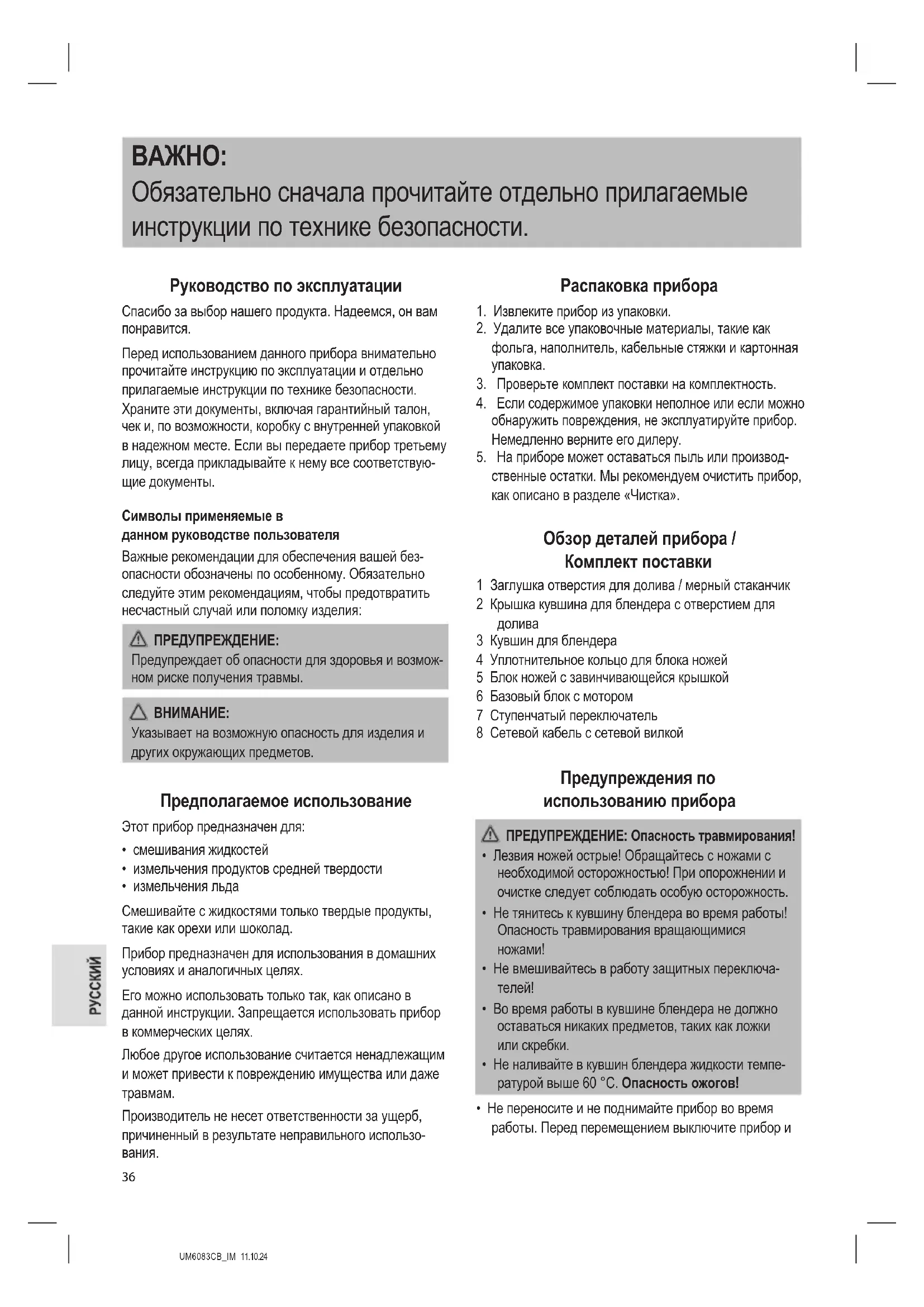 - Не переносите и не поднимайте прибор во время работы. Перед перемещением выключите прибор иUM6083CB_IM 11.10.24