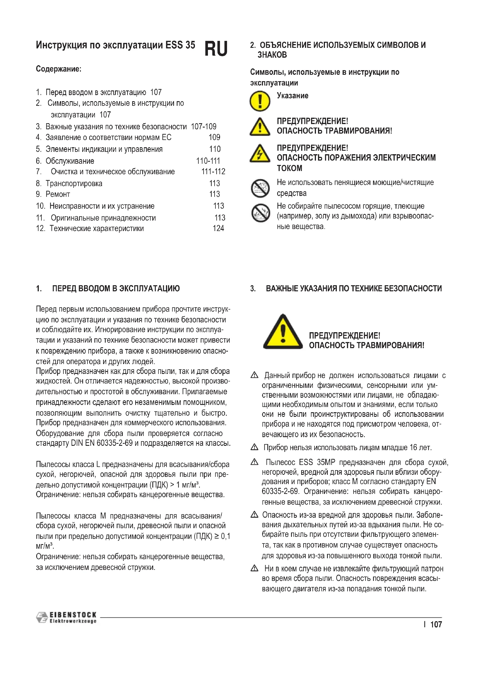 Указанная далее машина по своему конструктивному замыслу и исполнению соответствует основным применимым требованиям по технике безопасности и охране здоровья директив ЕС.В случае изменения машины клиентом данное заявление становится недействительным.Изделие: пылесос для влажной и сухой уборкиТип: ESS 35 LP (09932000) / ESS 35 MP (09931000)Применимые директивы ЕС:2014/30/ЕС2011/65/ЕС (ROHS)2006/42/ЕСПрименявшиеся гармонизированные стандарты:EN 60335-1:2012EN 60335-2-69: 2012EN 62233: 2008 EN 55014-1:2017EN 55014-2:2015 EN 61000-3-2:2019EN 61000-3-3:2013Elektrowerkzeuge GmbH, 08309 Eibenstock / Germany03/2022Lothar Lässig Frank MarkertGeneral Manager Head of Engineering ГАРАНТИРОВАННЫЙОБЪЕМВСАСЫВАНИЯ110 I1. Переключатель для настройки диаметра шланга (только для пылесоса класса М)2. Вкл./выкл. функции очистки, контрольная лампа 3. Сигнальная лампа и звуковой сигнал для предупреждения об cкорость воздуха < 20 м/с (только для пылесоса класса M)4. Прибор ВЫКЛ.5. Стандартный режим6. Автоматический режим с подключенным инструментом7. Розетка