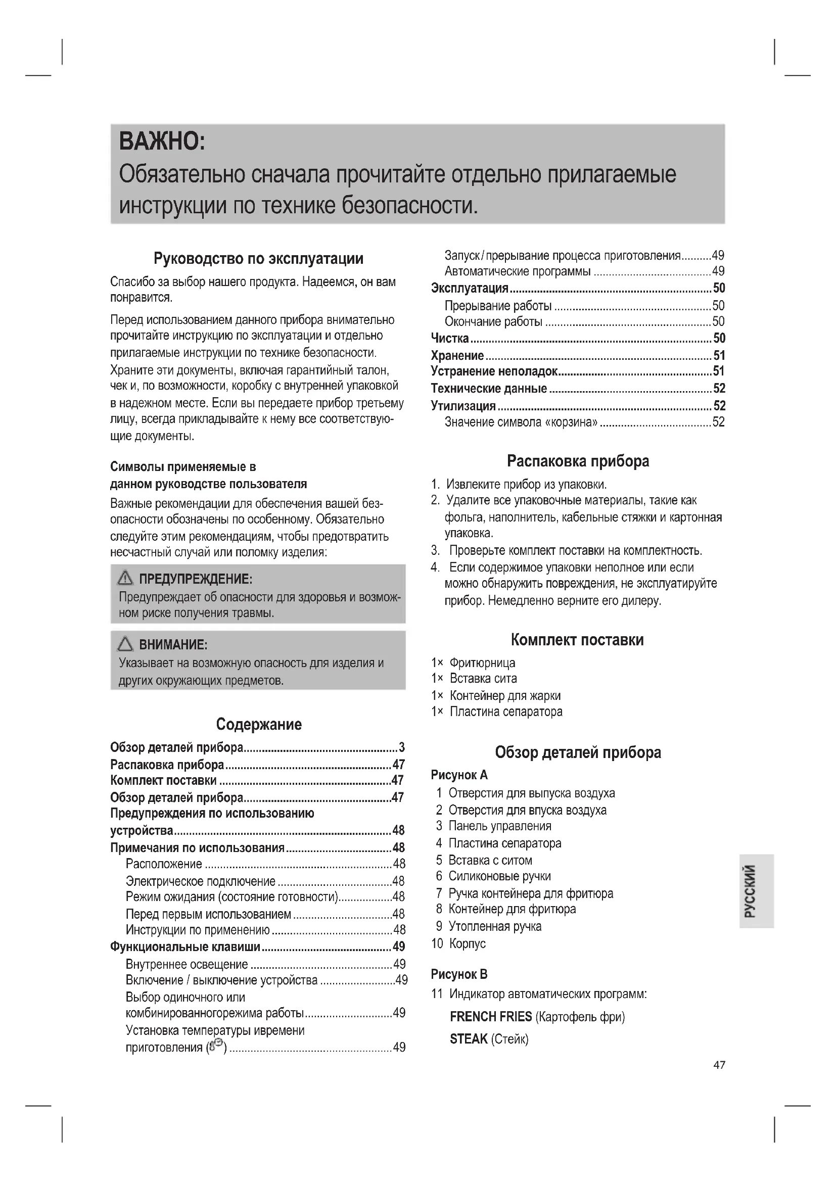 можно обнаружить повреждения, не эксплуатируйте прибор. Немедленно верните его дилеру. Комплект поставки 1× Фритюрница 1× Вставка сита 1× Контейнер для жарки 1× Пластина сепаратора Обзор деталей прибора Рисунок A 1 Отверстия для выпуска воздуха 2 Отверстия для впуска воздуха 3 Панель управления 4 Пластина сепаратора 5 Вставка с ситом 6 Силиконовые ручки 7 Ручка контейнера для фритюра 8 Контейнер для фритюра 9 Утопленная ручка 10 Корпус Рисунок B 11 Индикатор автоматических программ: FRENCH FRIES (Картофель фри) STEAK (Стейк)48 PIZZA (Пицца) VEGETABLE (Овощи) CHICKEN (Куриные крылышки) CAKE (Торт) BACON (Бекон) FISH (Рыба) SHRIMPS (Креветки) KEEP WARM (Держать в тепле) 12 Панели управления отделениями фритюрницы