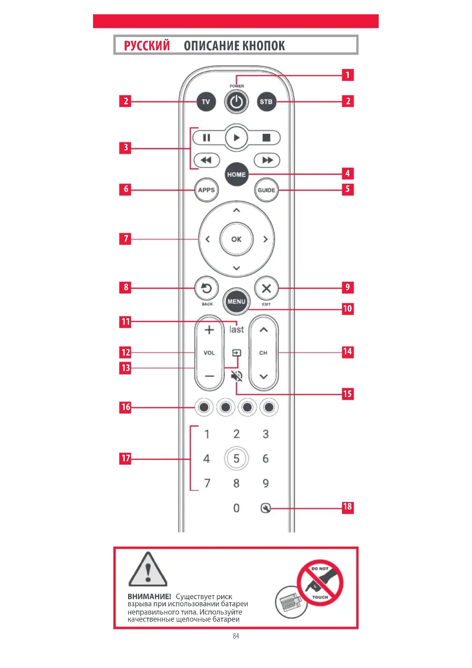 Кнопки RGYB (красная, зеленая, желтая, синяя) Кнопки быстрого доступа к меню текущего устройства.