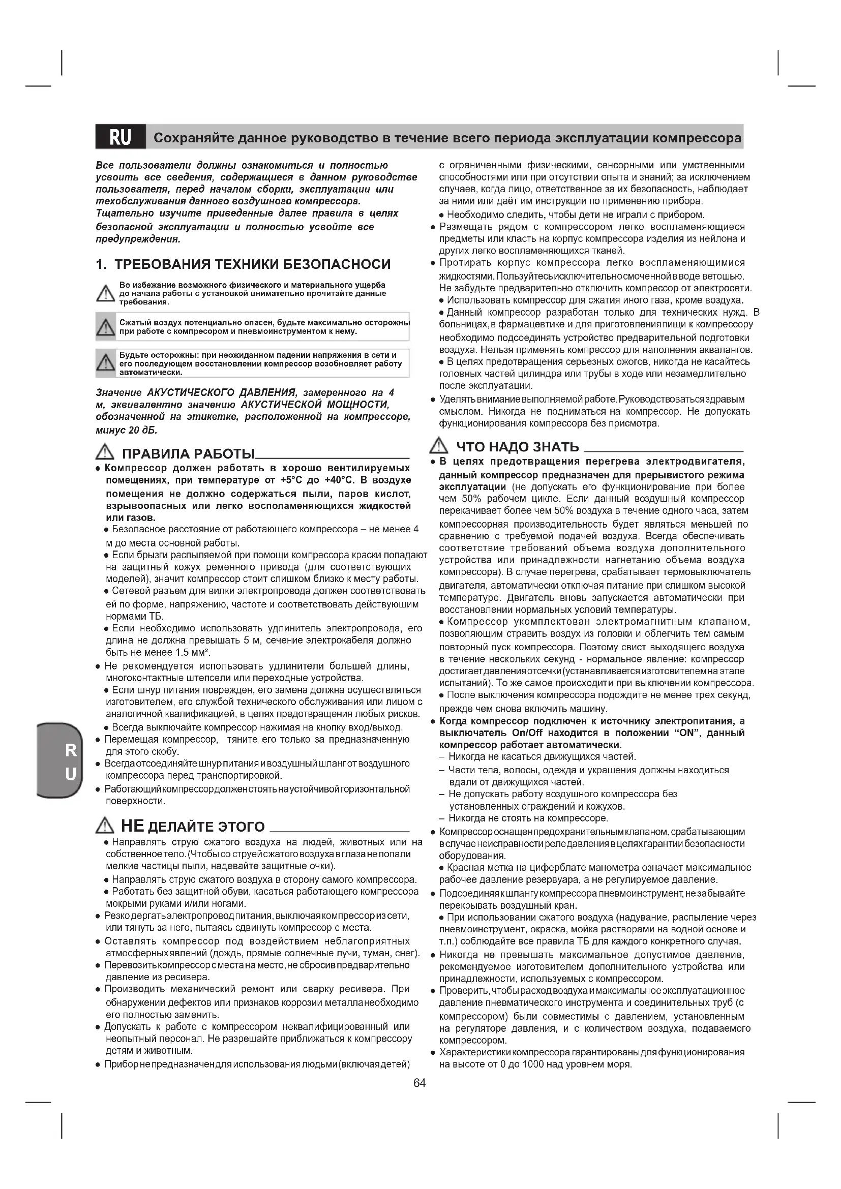 Во избежание возможного физического и материального ущерба до начала работы с установкой внимательно прочитайте данные требования.Сжатый воздух потенциально опасен, будьте максимально осторожны при работе с компресором и пневмоинструментом к нему.Будьте осторожны: при неожиданном падении напряжения в сети и его последующем восстановлении компрессор возобновляет работу автоматически. Значение АКУСТИЧЕСКОГО ДАВЛЕНИЯ, замеренного на 4 м, эквивалентно значению АКУСТИЧЕСКОЙ МОЩНОСТИ, обозначенной на этикетке, расположенной на компрессоре, минус 20 дБ. ПРАВИЛА РАБОТЫ ● Компрессор должен работать в хорошо вентилируемых помещениях, при температуре от +5°C до +40°C. В воздухе помещения не должно содержаться пыли, паров кислот, взрывоопасных или легко восполаменяющихся жидкостей
