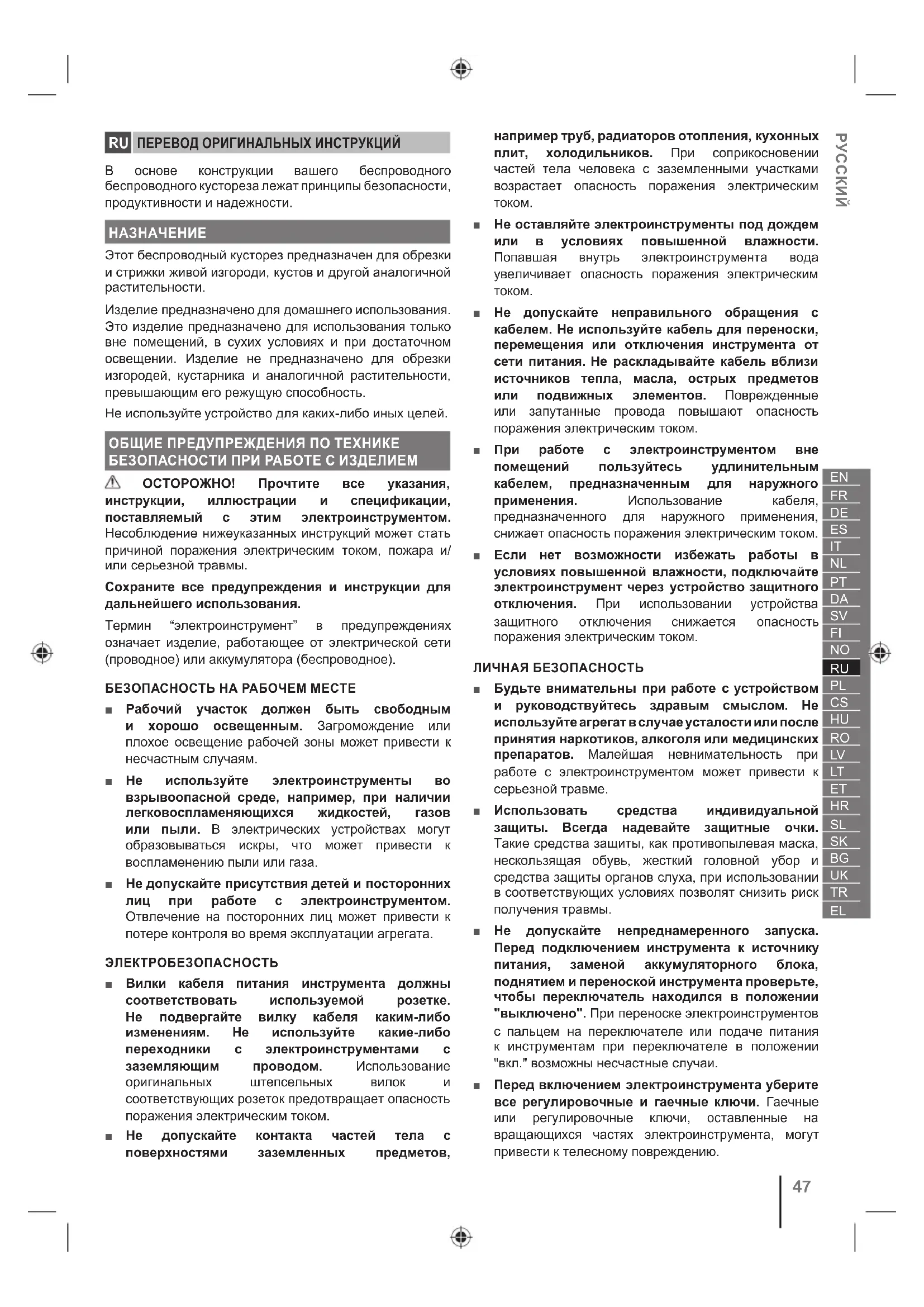 Этот беспроводный кусторез предназначен для обрезки и стрижки живой изгороди, кустов и другой аналогичной растительности. Изделие предназначено для домашнего использования. Это изделие предназначено для использования только вне помещений, в сухих условиях и при достаточном освещении. Изделие не предназначено для обрезки изгородей, кустарника и аналогичной растительности, превышающим его режущую способность. Не используйте устройство для каких-либо иных целей. ОБЩИЕ ПРЕДУПРЕЖДЕНИЯ ПО ТЕХНИКЕ БЕЗОПАСНОСТИ ПРИ РАБОТЕ С ИЗДЕЛИЕМ ОСТОРОЖНО! Прочтите все указания, инструкции, иллюстрации и спецификации, поставляемый с этим электроинструментом. Несоблюдение нижеуказанных инструкций может стать причиной поражения электрическим током, пожара и/ или серьезной травмы. Сохраните все предупреждения и инструкции для дальнейшего использования. Термин “электроинструмент” в предупреждениях означает изделие, работающее от электрической сети (проводное) или аккумулятора (беспроводное). БЕЗОПАСНОСТЬ НА РАБОЧЕМ МЕСТЕ ■ Рабочий участок должен быть свободным и хорошо освещенным. Загромождение или плохое освещение рабочей зоны может привести к несчастным случаям. ■ Не используйте электроинструменты во взрывоопасной среде, например, при наличии легковоспламеняющихся жидкостей, газов или пыли. В электрических устройствах могут образовываться искры, что может привести к воспламенению пыли или газа. ■ Не допускайте присутствия детей и посторонних лиц при работе с электроинструментом. Отвлечение на посторонних лиц может привести к потере контроля во время эксплуатации агрегата. ЭЛЕКТРОБЕЗОПАСНОСТЬ ■ Вилки кабеля питания инструмента должны соответствовать используемой розетке. Не подвергайте вилку кабеля каким-либо изменениям. Не используйте какие-либо переходники с электроинструментами с заземляющим проводом. Использование оригинальных штепсельных вилок и соответствующих розеток предотвращает опасность поражения электрическим током. ■ Не допускайте контакта частей тела с поверхностями заземленных предметов, например труб, радиаторов отопления, кухонных плит, холодильников. При соприкосновении частей тела человека с заземленными участками возрастает опасность поражения электрическим