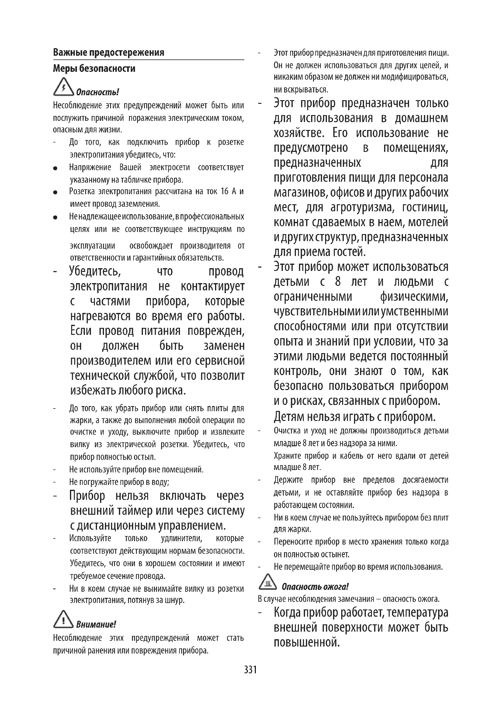 Несоблюдение этих предупреждений может стать причиной ранения или повреждения прибора. - Этот прибор предназначен для приготовления пищи. Он не должен использоваться для других целей, и никаким образом не должен ни модифицироваться, ни вскрываться. - Этот прибор предназначен только для использования в домашнем хозяйстве. Его использование не предусмотрено в помещениях, предназначенных для приготовления пищи для персонала магазинов, офисов и других рабочих мест, для агротуризма, гостиниц, комнат сдаваемых в наем, мотелей и других структур, предназначенных для приема гостей. - Этот прибор может использоваться детьми с 8 лет и людьми с ограниченными физическими, чувствительными или умственными способностями или при отсутствии опыта и знаний при условии, что за этими людьми ведется постоянный контроль, они знают о том, как безопасно пользоваться прибором и о рисках, связанных с прибором. Детям нельзя играть с прибором. - Очистка и уход не должны производиться детьми младше 8 лет и без надзора за ними. Храните прибор и кабель от него вдали от детей младше 8 лет. - Держите прибор вне пределов досягаемости детьми, и не оставляйте прибор без надзора в работающем состоянии. - Ни в коем случае не пользуйтесь прибором без плит