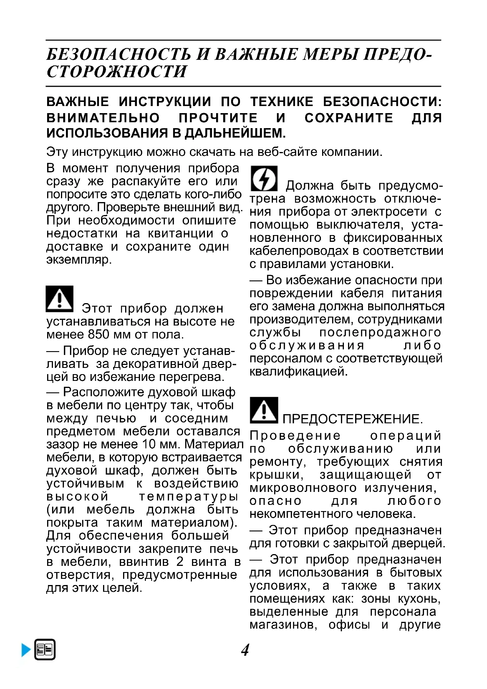 Этот прибор должен устанавливаться на высоте не менее 850 мм от пола. — Прибор не следует устанав- ливать за декоративной двер- цей во избежание перегрева. — Расположите духовой шкаф в мебели по центру так, чтобы между печью и соседним предметом мебели оставался зазор не менее 10 мм. Материал мебели, в которую встраивается духовой шкаф, должен быть устойчивым к воздействию высокой температуры (или мебель должна быть покрыта таким материалом). Для обеспечения большей устойчивости закрепите печь в мебели, ввинтив 2 винта в отверстия, предусмотренные для этих целей. Должна быть предусмо- трена возможность отключе- ния прибора от электросети с помощью выключателя, уста- новленного в фиксированных кабелепроводах в соответствии с правилами установки. — Во избежание опасности при повреждении кабеля питания его замена должна выполняться производителем, сотрудниками службы послепродажного обслуживания либо персоналом с соответствующей квалификацией. ПРЕДОСТЕРЕЖЕНИЕ. Проведение операций по обслуживанию или ремонту, требующих снятия крышки, защищающей от микроволнового излучения, опасно для любого некомпетентного человека. — Этот прибор предназначен для готовки с закрытой дверцей. — Этот прибор предназначен для использования в бытовых условиях, а также в таких помещениях как: зоны кухонь, выделенные для персонала магазинов, офисы и другие ВАЖНЫЕ ИНСТРУКЦИИ ПО ТЕХНИКЕ БЕЗОПАСНОСТИ: ВНИМАТЕЛЬНО ПРОЧТИТЕ И СОХРАНИТЕ ДЛЯ ИСПОЛЬЗОВАНИЯ В ДАЛЬНЕЙШЕМ. Эту инструкцию можно скачать на веб-сайте компании.5 БЕЗОПАСНОСТЬ И ВАЖНЫЕ МЕРЫ ПРЕДО- СТОРОЖНОСТИ служебные помещения; фермы; для использования посетителями гостиниц, отелей и других учреждений жилого назначения, в гостиничных номерах. — Этот прибор может использоваться детьми от 8 лет и старше, людьми с ограниченными физическими, сенсорными и умственными возможностями, а также людьми с нехваткой опыта и знаний под контролем ответственного за их безопасность лица после прохождения предварительного инструктажа по безопасному использованию прибора и получения информации о рисках, которым они подвергаются. — Детям запрещено играть с прибором. Не следует разрешать детям без присмотра осуществлять очистку и техобслуживание. — Следите за тем, чтобы дети не играли с прибором. ПРЕДОСТЕРЕЖЕНИЕ. Прибор и его части, находящиеся в открытом доступе, могут сильно нагреваться во время работы. Будьте внимательны и не притрагивайтесь к нагревательным элементам, которые находятся внутри духового шкафа. Дети младше 8 лет могут находиться возле духового шкафа только под постоянным наблюдением