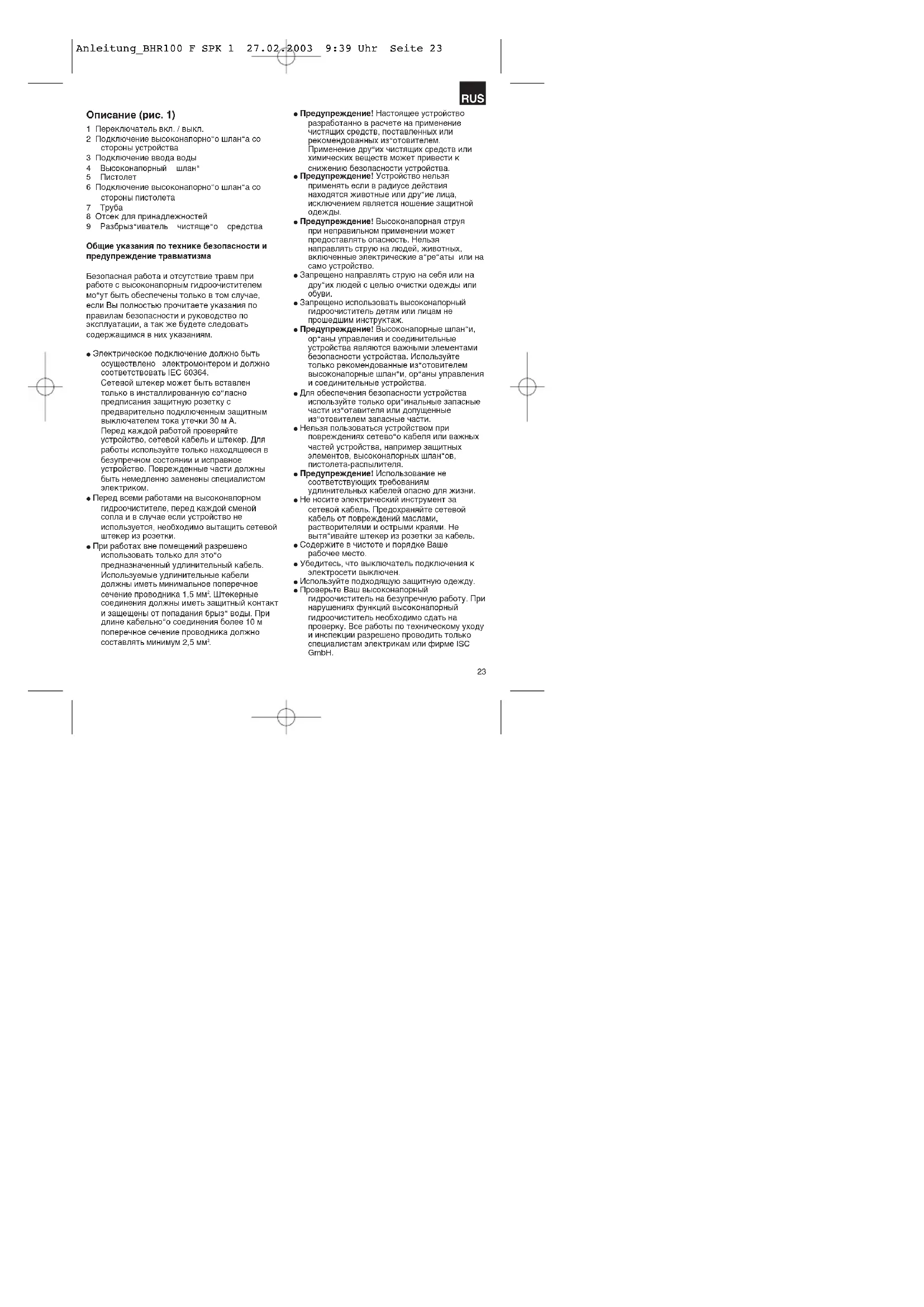 Anleitung_BHR100 F SPK 1 27.02.2003 9:39 Uhr Seite 2223 Описание (рис. 1) 1 Переключатель вкл. / выкл. 2 Подключение высоконапорно“о шлан“а со стороны устройства 3 Подключение ввода воды 4 Высоконапорный шлан“ 5 Пистолет 6 Подключение высоконапорно“о шлан“а со стороны пистолета 7 Труба 8 Отсек для принадлежностей 9 Разбрыз“иватель чистяще“о средства Общие указания по технике безопасности и предупреждение травматизма Безопасная работа и отсутствие травм при работе с высоконапорным гидроочистителем мо“ут быть обеспечены только в том случае, если Вы полностью прочитаете указания по правилам безопасности и руководство по эксплуатации, а так же будете следовать содержащимся в них указаниям. Электрическое подключение должно быть осуществлено электромонтером и должно соответствовать IEC 60364. Сетевой штекер может быть вставлен только в инсталлированную со“ласно предписания защитную розетку с предварительно подключенным защитным выключателем тока утечки 30 м А. Перед каждой работой проверяйте устройство, сетевой кабель и штекер. Для работы используйте только находящееся в безупречном состоянии и исправное устройство. Поврежденные части должны быть немедленно заменены специалистом электриком. Перед всеми работами на высоконапорном гидроочистителе, перед каждой сменой сопла и в случае если устройство не используется, необходимо вытащить сетевой штекер из розетки. При работах вне помещений разрешено использовать только для это“о предназначенный удлинительный кабель. Используемые удлинительные кабели должны иметь минимальное поперечное сечение проводника 1,5 мм