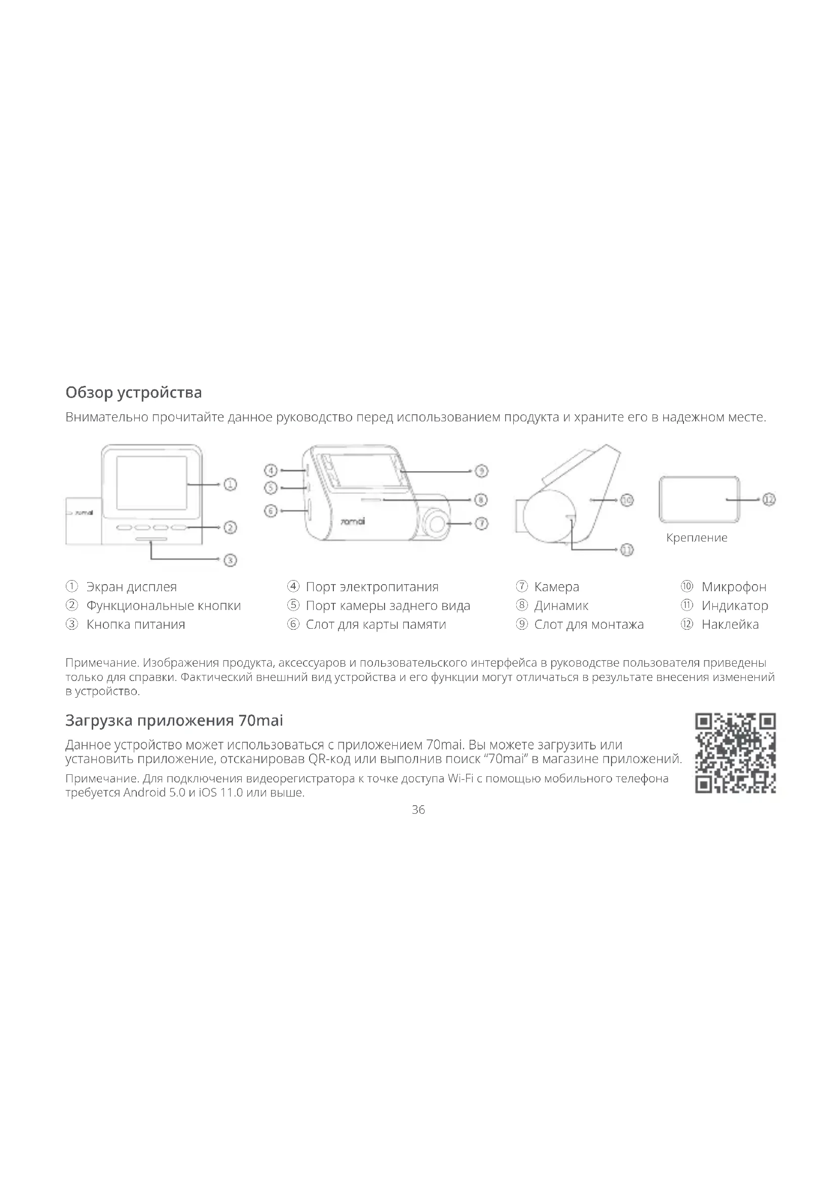 - La dash cam e i suoi accessori potrebbero contenere parti di piccole dimensioni. Per evitare il soocamento o altri rischi o danni causati dai bambini, tenere la dash cam fuori dalla portata dei bambini.35 Assistenza: help@70mai.com Per altre informazioni, andare su www.70mai.com Produttore: 70mai Co., Ltd. Indirizzo: Room 2220, Building 2, n. 588 Zixing Road, Minhang District, Shanghai, China36 Обзор устройства Внимательно прочитайте данное руководство перед использованием продукта и храните его в надежном месте. Примечание. Изображения продукта, аксессуаров и пользовательского интерфейса в руководстве пользователя приведены только для справки. Фактический внешний вид устройства и его функции могут отличаться в результате внесения изменений в устройство.