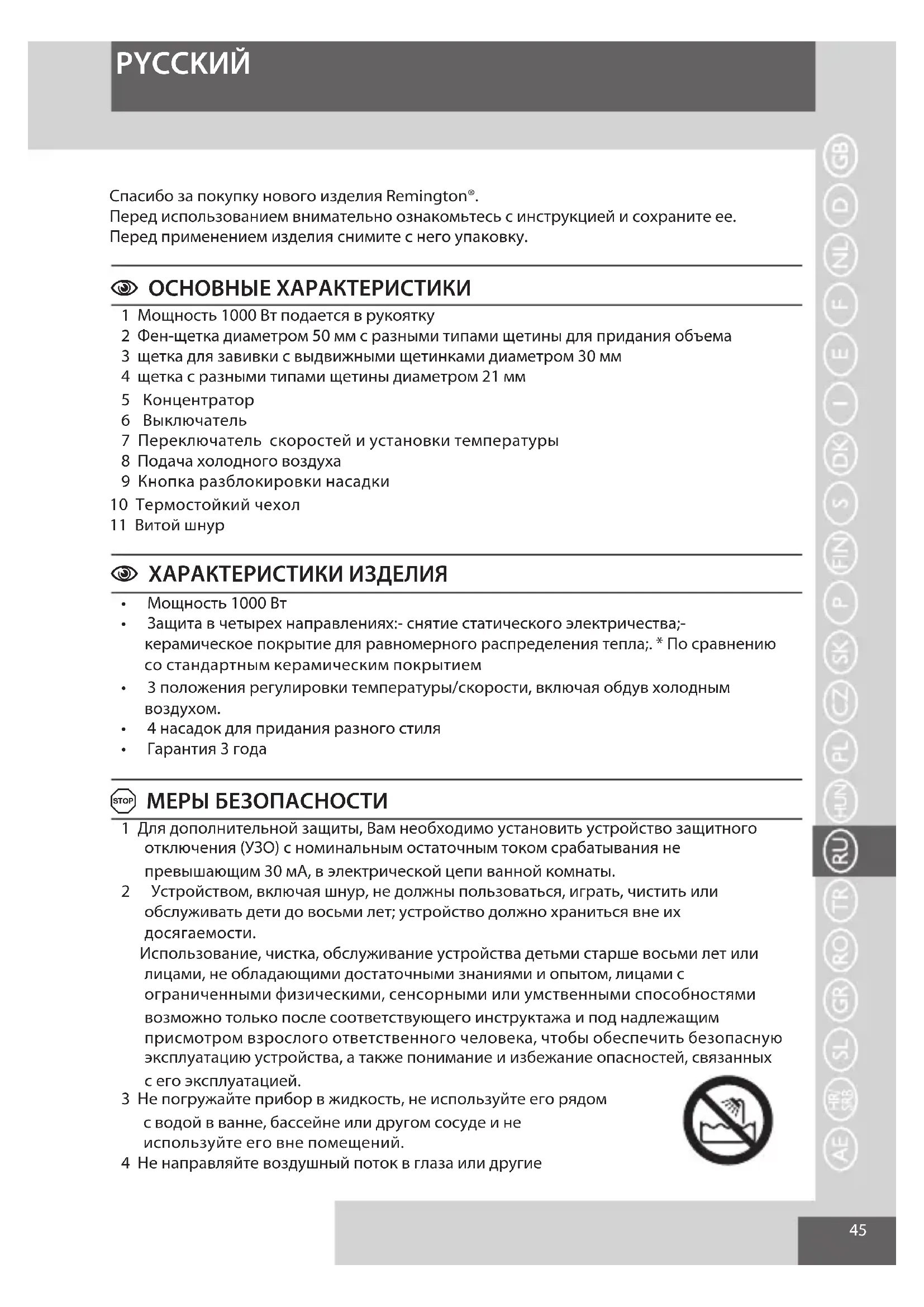 Importőr:VartaHungáriaKft,1191,Budapest,AdyEndreút42-44. (eznemszervizközpont,problémaeseténelőzetesenegyeztessenügyfélszolgálatunkkal) Gyártmány:REMINGTON®. Jótállásiidő:3évForgalmazóneve,címe: Típus: Vásárlásidőpontja: Eladószerváltalkitöltendő!45 PYCCKИЙ Спасибо за покупку нового изделия Remington®. Перед использованием внимательно ознакомьтесь с инструкцией и сохраните ее. Перед применением изделия снимите с него упаковку. C ОСНОВНЫЕ ХАРАКТЕРИСТИКИ 1 Мощность 1000 Вт подается в рукоятку 2 Фен-щетка диаметром 50 мм с разными типами щетины для придания объема 3 щетка для завивки с выдвижными щетинками диаметром 30 мм 4 щетка с разными типами щетины диаметром 21 мм 5 Концентратор 6 Выключатель 7 Переключатель скоростей и установки температуры 8 Подача холодного воздуха 9 Кнопка разблокировки насадки 10 Термостойкий чехол 11 Витой шнур C ХАРАКТЕРИСТИКИ ИЗДЕЛИЯ