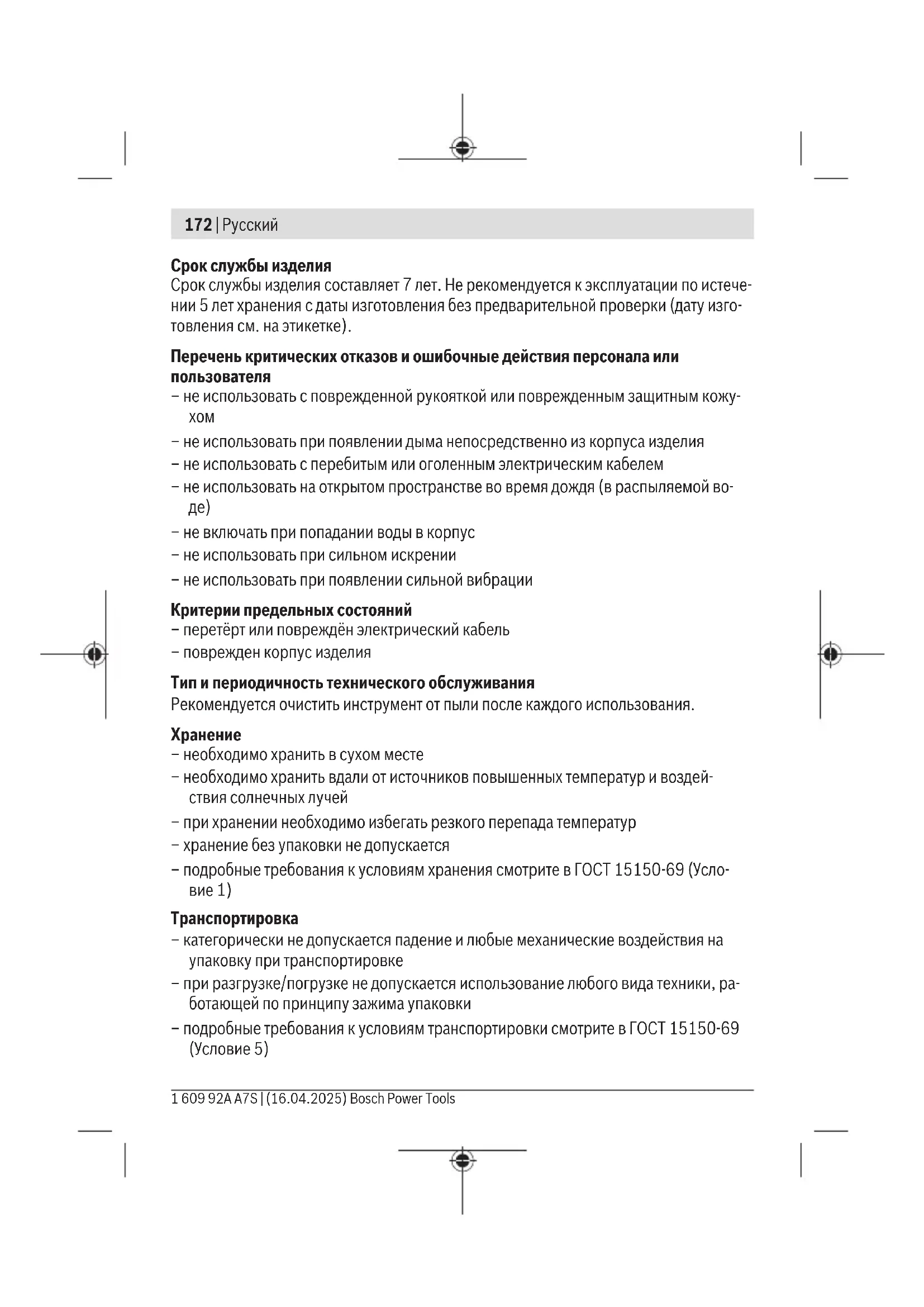 Информация о подтверждении соответствия содержится в приложении. Информация о стране происхождения указана на корпусе изделия и в приложении. Дата изготовления указана на корпусе изделия. Контактная информация относительно импортера содержится на упаковке. Bosch Power Tools 1 609 92A A7S | (16.04.2025)172 | Русский Срок службы изделия Срок службы изделия составляет 7 лет. Не рекомендуется к эксплуатации по истече- нии 5 лет хранения с даты изготовления без предварительной проверки (дату изго- товления см. на этикетке). Перечень критических отказов и ошибочные действия персонала или пользователя – не использовать с поврежденной рукояткой или поврежденным защитным кожу-