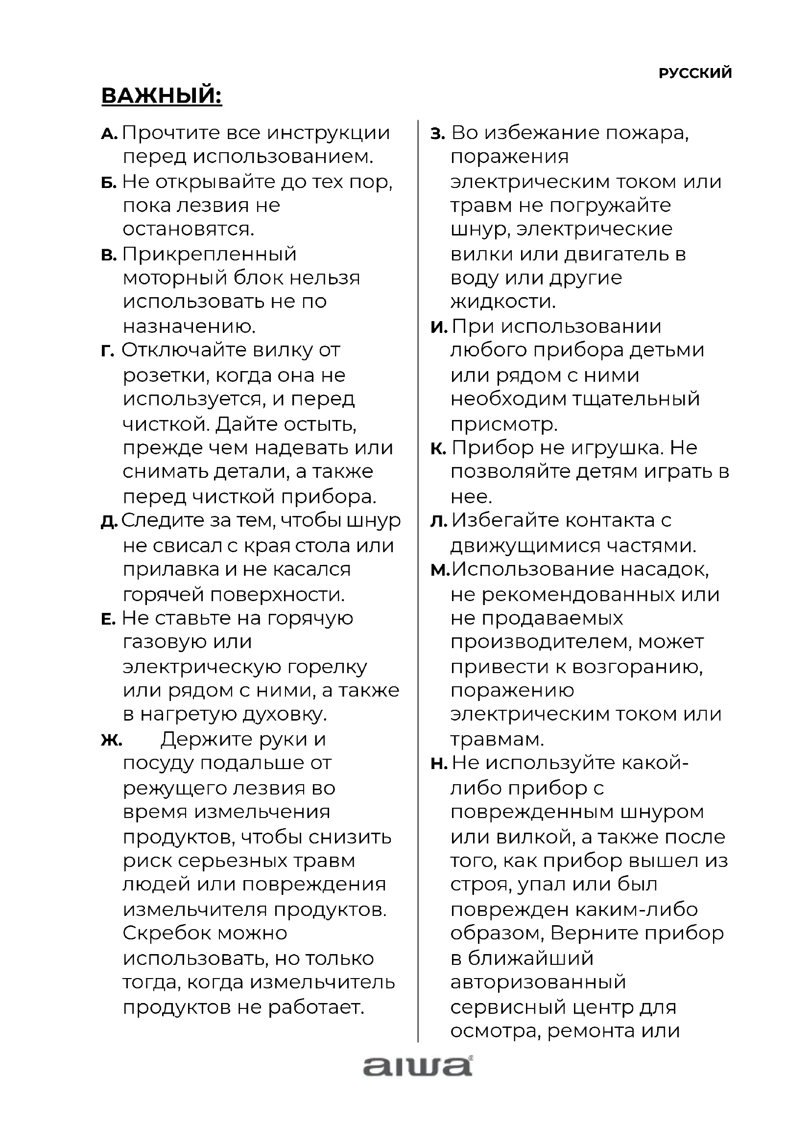 А. Прочтите все инструкции перед использованием. Б. Не открывайте до тех пор, пока лезвия не остановятся. В. Прикрепленный моторный блок нельзя использовать не по назначению. Г. Отключайте вилку от розетки, когда она не используется, и перед чисткой. Дайт е остыть, прежде чем надевать или снимать детали, а также перед чисткой прибора. Д. Следите за тем, чтобы шнур не свисал с края стола или прилавка и не касался горячей повер хности. Е. Не ставь т е на горячую газовую или электрическую горелку или рядом с ними, а также в нагретую духовку. Ж. Держите руки и посуду подальше от режущего ле звия во время измельчения продуктов, чтобы снизить риск серьезных травм людей или повреждения измельчителя продуктов. Скребок можно использовать, но только тогда, когда измельчитель продуктов не работает. З. Во избежание пожар а,