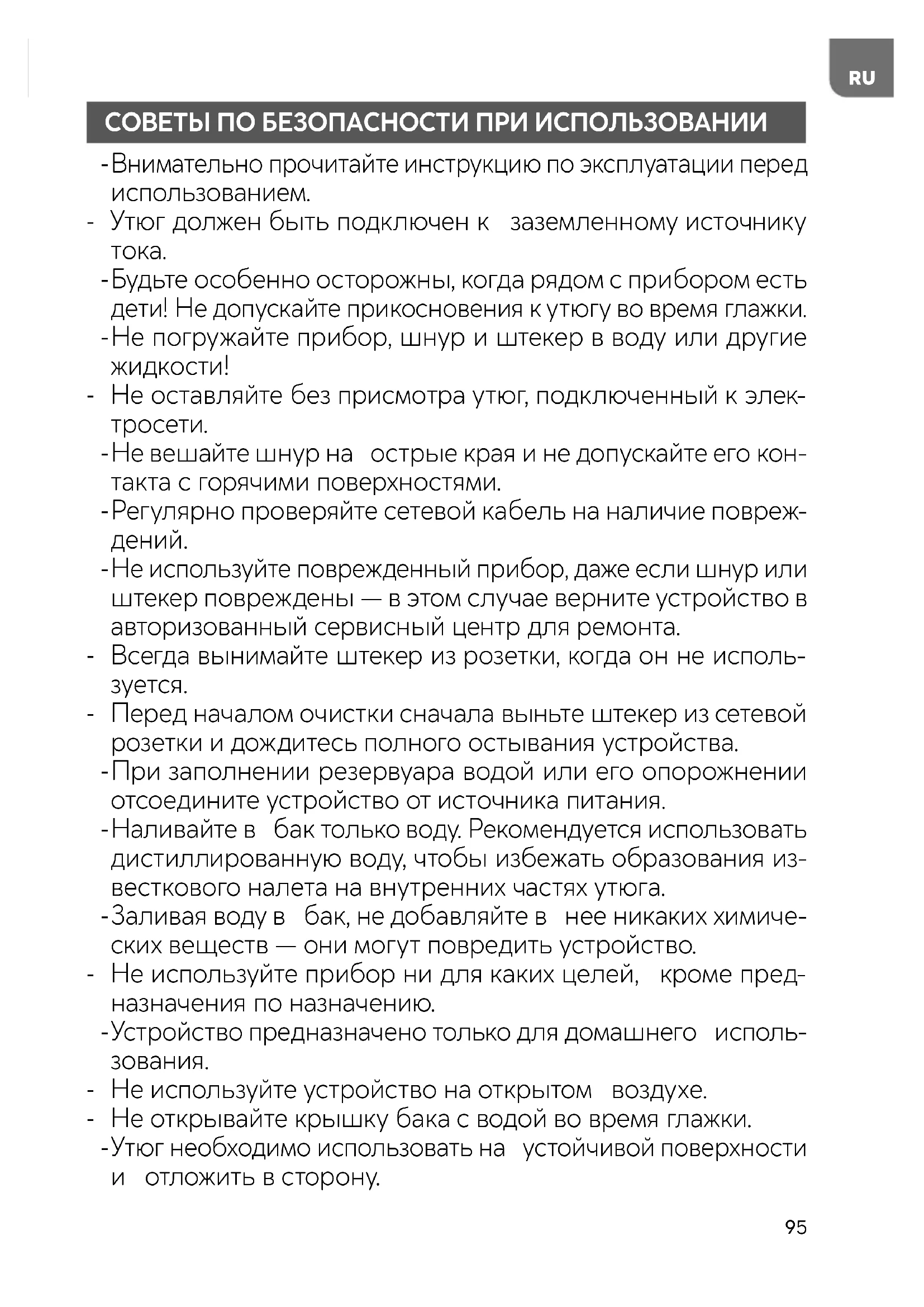 - Не используйте устройство на открытом воздухе. - Не открывайте крышку бака с водой во время глажки.