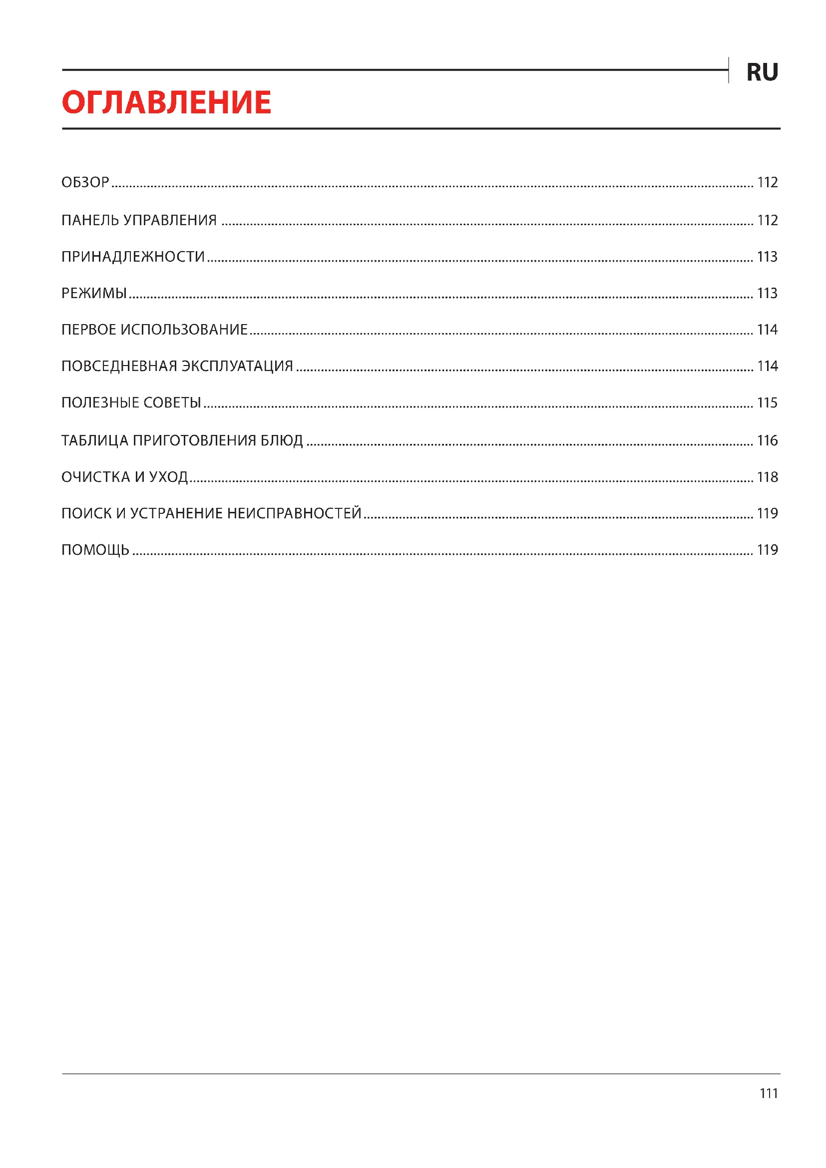 ОБЗОР 112 ПАНЕЛЬ УПРАВЛЕНИЯ 112 ПРИНАДЛЕЖНОСТИ 113 РЕЖИМЫ 113 ПЕРВОЕ ИСПОЛЬЗОВАНИЕ 114 ПОВСЕДНЕВНАЯ ЭКСПЛУАТАЦИЯ 114 ПОЛЕЗНЫЕ СОВЕТЫ 115 ТАБЛИЦА ПРИГОТОВЛЕНИЯ БЛЮД 116 ОЧИСТКА И УХОД 118 ПОИСК И УСТРАНЕНИЕ НЕИСПРАВНОСТЕЙ 119 ПОМОЩЬ 119112