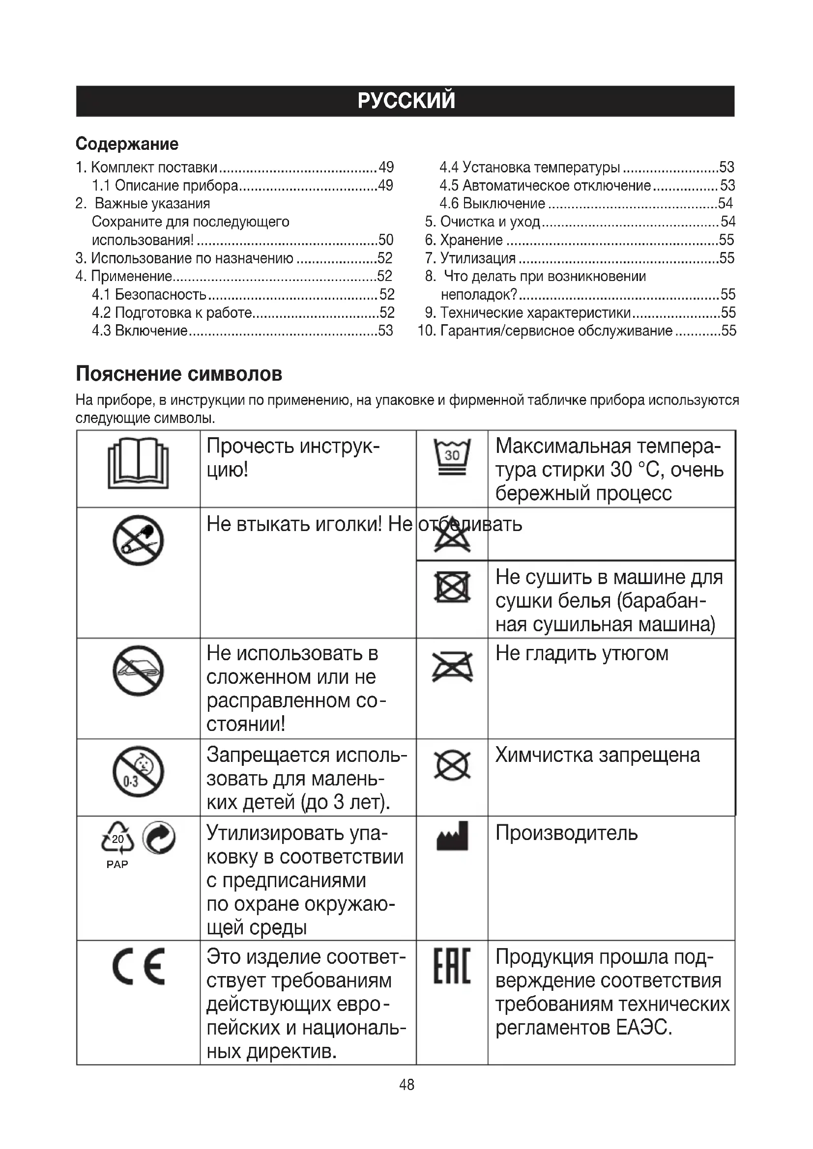 пейских и националь- ных директив. Πродyкция прошла под- верждение соответствия требованиям технических регламентов ЕАЭС.49 Прибор имеет двой- ную защитную изоля- цию и, таким обра- зом, соответствует классу защиты 2. Утилизация прибора в соответствии с Ди