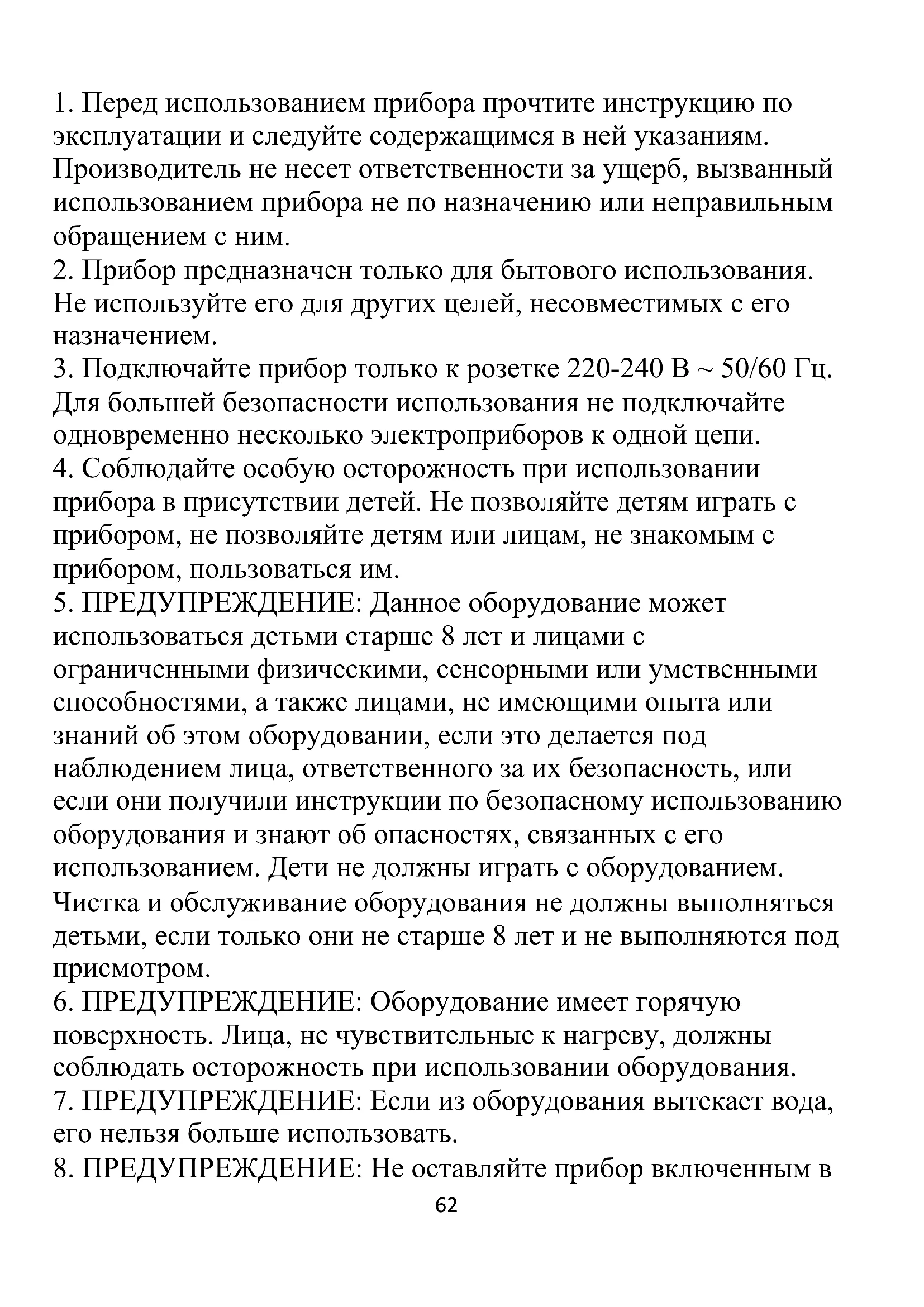 8. ПРЕДУПРЕЖДЕНИЕ: Не оставляйте прибор включенным в63