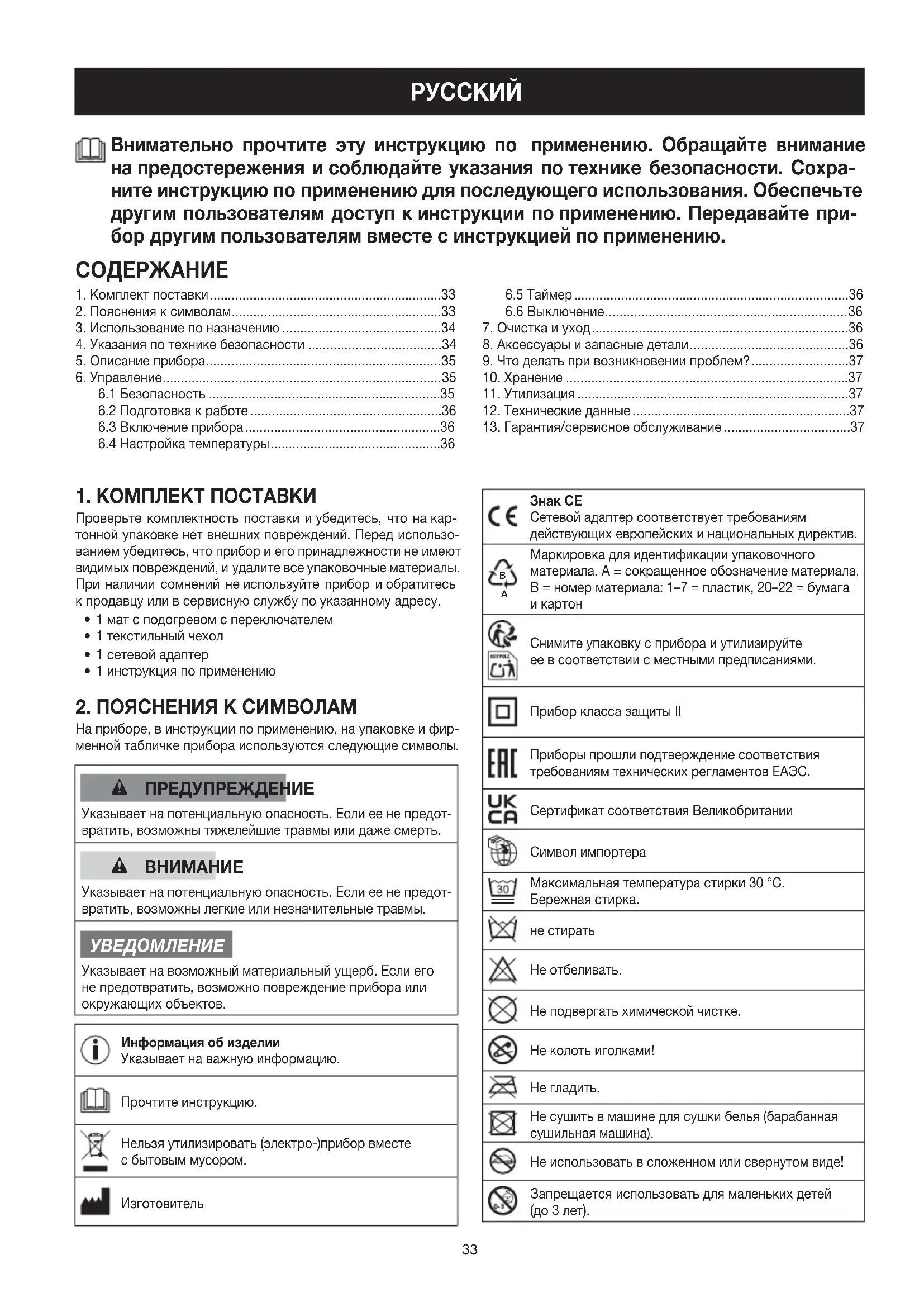 УВЕДОМЛЕНИЕ Перед использованием изделия убедитесь, что выиспользуе- те верхнюю сторону. Верхняя сторона обозначена наэтикетке чехла инанагревательном элементе словом «top». УВЕДОМЛЕНИЕ Проследите за тем, чтобы прибор во время использования несминался инанем необразовывались складки.