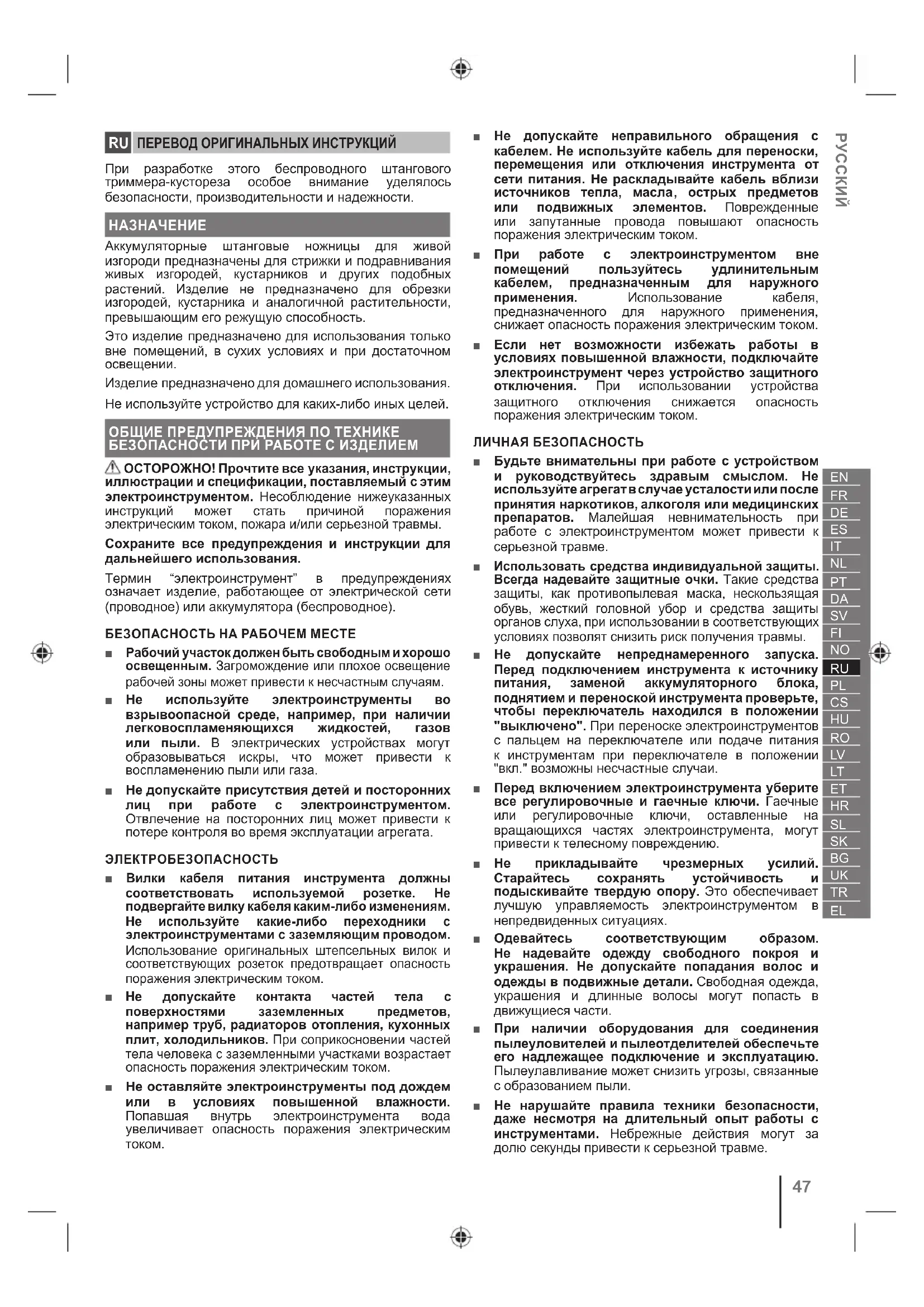 ПЕРЕВОД ОРИГИНАЛЬНЫХ ИНСТРУКЦИЙ При разработке этого беспроводного штангового триммера-кустореза особое внимание уделялось безопасности, производительности и надежности.