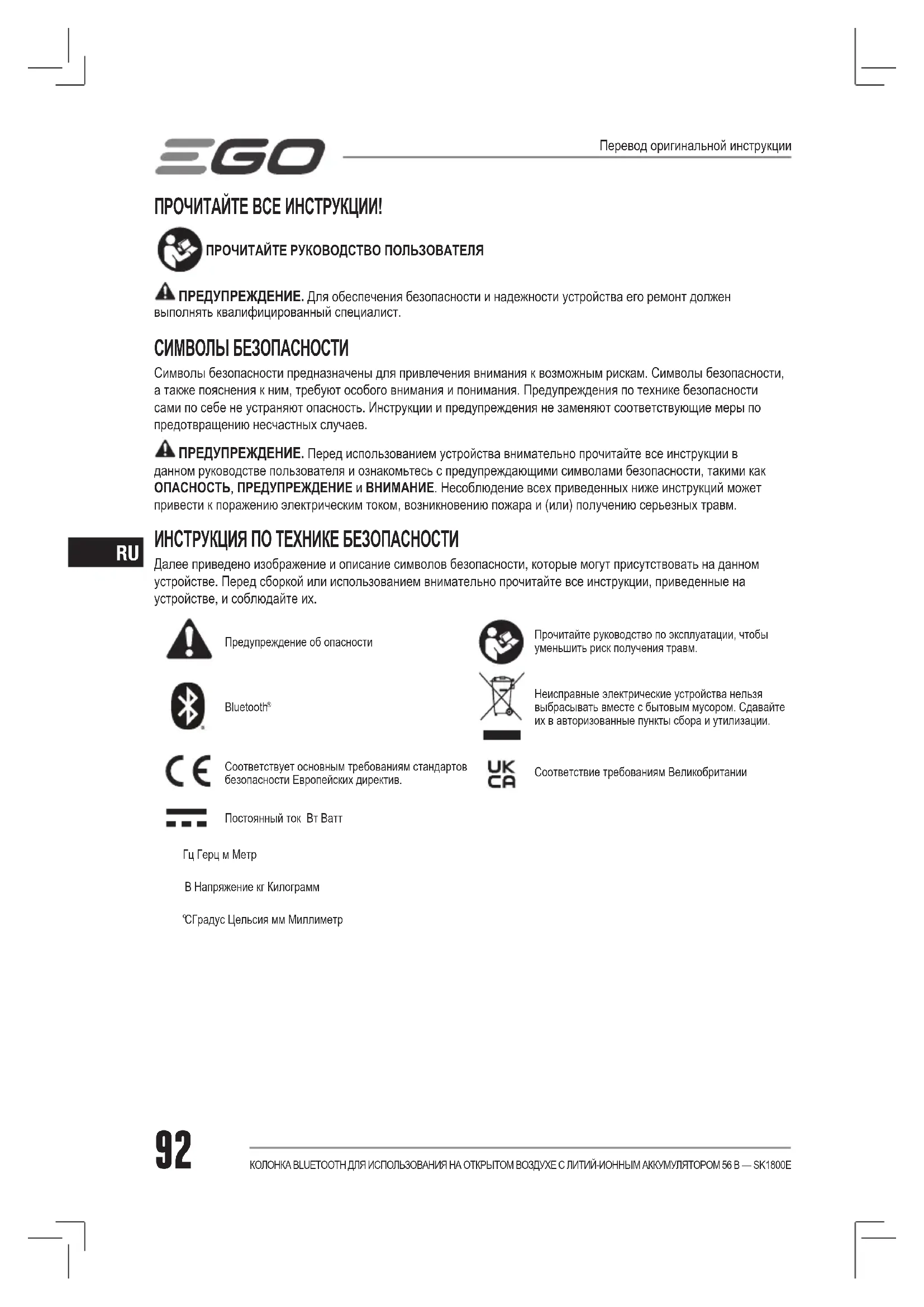 ПРОЧИТАЙТЕ ВСЕ ИНСТРУКЦИИ! ПРОЧИТАЙТЕ РУКОВОДСТВО ПОЛЬЗОВАТЕЛЯ ПРЕДУПРЕЖДЕНИЕ. Для обеспечения безопасности и надежности устройства его ремонт должен выполнять квалифицированный специалист. СИМВОЛЫ БЕЗОПАСНОСТИ Символы безопасности предназначены для привлечения внимания к возможным рискам. Символы безопасности, а также пояснения к ним, требуют особого внимания и понимания. Предупреждения по технике безопасности сами по себе не устраняют опасность. Инструкции и предупреждения не заменяют соответствующие меры по предотвращению несчастных случаев. ПРЕДУПРЕЖДЕНИЕ. Перед использованием устройства внимательно прочитайте все инструкции в данном руководстве пользователя и ознакомьтесь с предупреждающими символами безопасности, такими как ОПАСНОСТЬ, ПРЕДУПРЕЖДЕНИЕ и ВНИМАНИЕ. Несоблюдение всех приведенных ниже инструкций может привести к поражению электрическим током, возникновению пожара и (или) получению серьезных травм. ИНСТРУКЦИЯ ПО ТЕХНИКЕ БЕЗОПАСНОСТИ Далее приведено изображение и описание символов безопасности, которые могут присутствовать на данном устройстве. Перед сборкой или использованием внимательно прочитайте все инструкции, приведенные на устройстве, и соблюдайте их. Предупреждение об опасностиПрочитайте руководство по эксплуатации, чтобы уменьшить риск получения травм.Bluetooth Неисправные электрические устройства нельзя выбрасывать вместе с бытовым мусором. Сдавайте их в авторизованные пункты сбора и утилизации.Соответствует основным требованиям стандартов безопасности Европейских директив.Соответствие требованиям ВеликобританииПостоянный ток Вт Ватт Гц Герц м МетрВ Напряжение кг Килограмм C Градус Цельсия мм Миллиметр Перевод оригинальной инструкции93