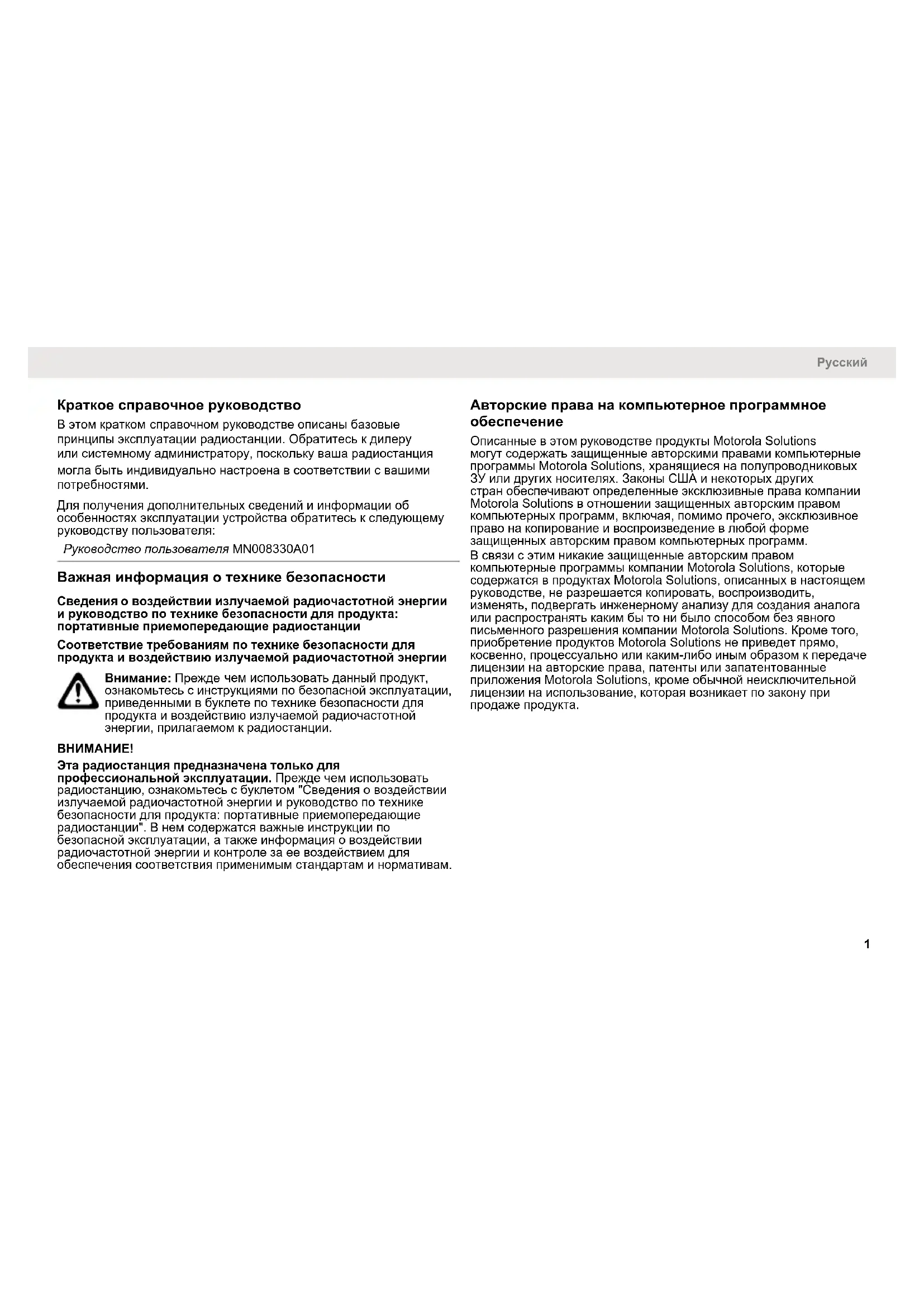 Эта радиостанция предназначена только для профессиональной эксплуатации. Прежде чем использовать радиостанцию, ознакомьтесь с буклетом "Сведения о воздействии излучаемой радиочастотной энергии и руководство по технике безопасности для продукта: портативные приемопередающие радиостанции". В нем содержатся важные инструкции по безопасной эксплуатации, а также информация о воздействии радиочастотной энергии и контроле за ее воздействием для обеспечения соответствия применимым стандартам и нормативам. Авторские права на компьютерное программное обеспечение Описанные в этом руководстве продукты Motorola Solutions могут содержать защищенные авторскими правами компьютерные программы Motorola Solutions, хранящиеся на полупроводниковых ЗУ или других носителях. Законы США и некоторых других стран обеспечивают определенные эксклюзивные права компании Motorola Solutions в отношении защищенных авторским правом компьютерных программ, включая, помимо прочего, эксклюзивное право на копирование и воспроизведение в любой форме защищенных авторским правом компьютерных программ. В связи с этим никакие защищенные авторским правом компьютерные программы компании Motorola Solutions, которые содержатся в продуктах Motorola Solutions, описанных в настоящем руководстве, не разрешается копировать, воспроизводить, изменять, подвергать инженерному анализу для создания аналога или распространять каким бы то ни было способом без явного письменного разрешения компании Motorola Solutions. Кроме того, приобретение продуктов Motorola Solutions не приведет прямо, косвенно, процессуально или каким-либо иным образом к передаче лицензии на авторские права, патенты или запатентованные приложения Motorola Solutions, кроме обычной неисключительной лицензии на использование, которая возникает по закону при продаже продукта.