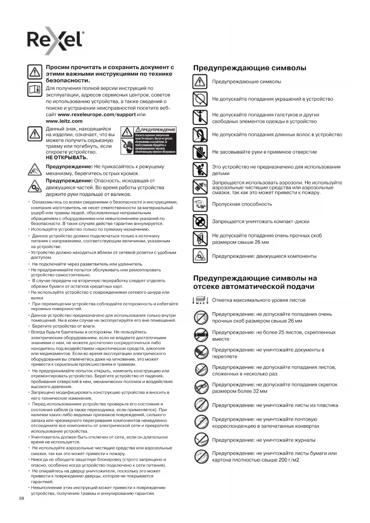 огда не обходите защитную блокировку (строго запрещено и опасно, особенно когда устройство подключено к сети питания).• Не опирайтесь на дверцу уничтожителя, поскольку это может привести к повреждению дверцы, которое не покрывается гарантией. Невыполнение этих инструкций может привести к повреждению устройства, получению травмы и аннулированию гарантии. Просим прочитать и сохранить документ с этими важными инструкциями по технике безопасности. Для получения полной версии инструкций по эксплуатации, адресов сервисных центров, советов по использованию устройства, а также сведений о поиске и устранении неисправностей посетите веб- сайт www.rexeleurope.com/support или www.leitz.com Не допускайте попадания украшений в устройство Не допускайте попадания галстуков и других свободных элементов одежды в устройство Предупреждающие символы Не допускайте попадания длинных волос в устройство Не засовывайте руки в приемное отверстие Предупреждающие символы Пропускная способность Запрещается уничтожать компакт-диски Не допускайте попадания очень прочных скоб размером свыше 26 мм Предупреждение: движущиеся компоненты Предупреждение: Не прикасайтесь к режущему механизму, берегитесь острых кромок. Предупреждение: Опасность, исходящая от движущихся частей. Во время работы устройства держите руки подальше от валиков. Это устройство не предназначено для использования