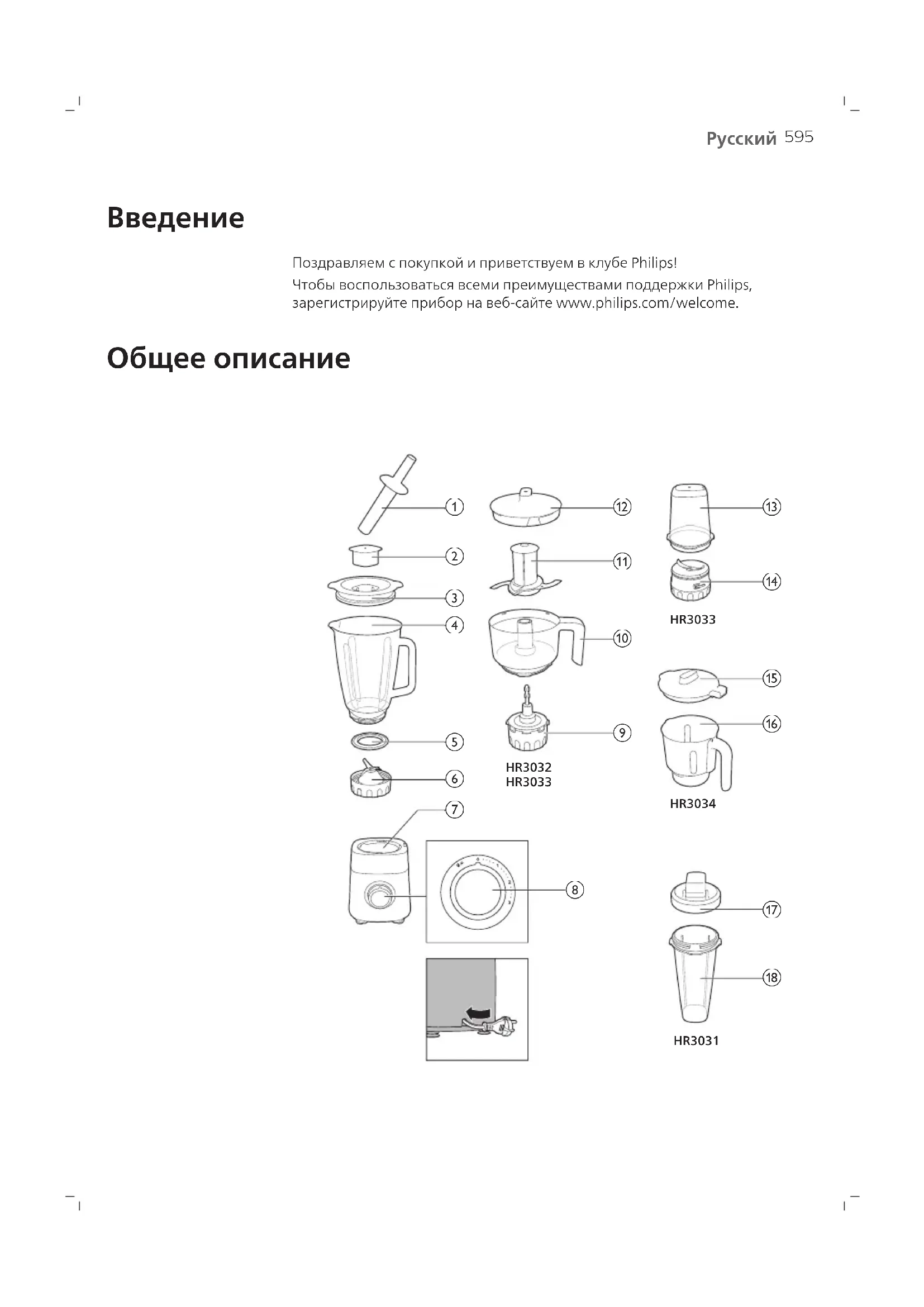 Поздравляем с покупкой и приветствуем в клубе Philips! Чтобы воспользоваться всеми преимуществами поддержки Philips, зарегистрируйте прибор на веб-сайте www.philips.com/welcome. Общее описание HR3034HR3031 HR3033HR3032 HR3033