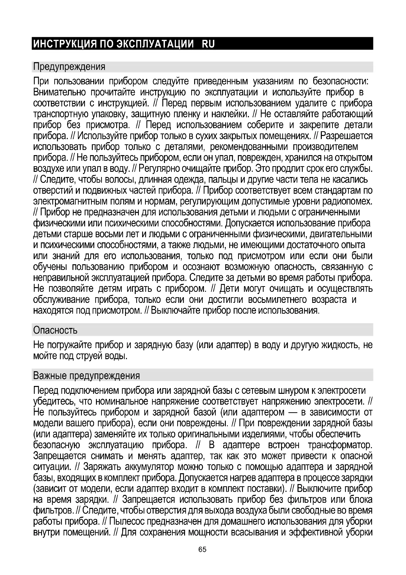 Не погружайте прибор и зарядную базу (или адаптер) в воду и другую жидкость, не мойте под струей воды. Важные предупреждения Перед подключением прибора или зарядной базы с сетевым шнуром к электросети убедитесь, что номинальное напряжение соответствует напряжению электросети. // Не пользуйтесь прибором и зарядной базой (или адаптером — в зависимости от модели вашего прибора), если они повреждены. // При повреждении зарядной базы (или адаптера) заменяйте их только оригинальными изделиями, чтобы обеспечить безопасную эксплуатацию прибора. // В адаптере встроен трансформатор. Запрещается снимать и менять адаптер, так как это может привести к опасной ситуации. // Заряжать аккумулятор можно только с помощью адаптера и зарядной базы, входящих в комплект прибора. Допускается нагрев адаптера в процессе зарядки (зависит от модели, если адаптер входит в комплект поставки). // Выключите прибор на время зарядки. // Запрещается использовать прибор без фильтров или блока фильтров. // Следите, чтобы отверстия для выхода воздуха были свободные во время работы прибора. // Пылесос предназначен для домашнего использования для уборки внутри помещений. // Для сохранения мощности всасывания и эффективной уборки 65следите за чистотой всасывающих отверстий. Регулярно очищайте отверстие трубы от пыли, волос и других загрязнений, которые могут блокировать воздушный поток. // Перед очисткой подставки или зарядной базы отсоедините ее от электросети. // Запрещается использовать прибор для уборки неостывшего пепла, опилок, окурков, спичек, жидкостей (например, пены для ковров), острых предметов (осколков и т.п.). // Не приближайте к себе всасывающее отверстие. // Не используйте прибор для уборки строительного мусора (мелкого песка, извести, цемента) и тонера для принтеров, так как это может привести к поломке прибора. Поиск и устранение неисправностей Неисправность Возможная причина