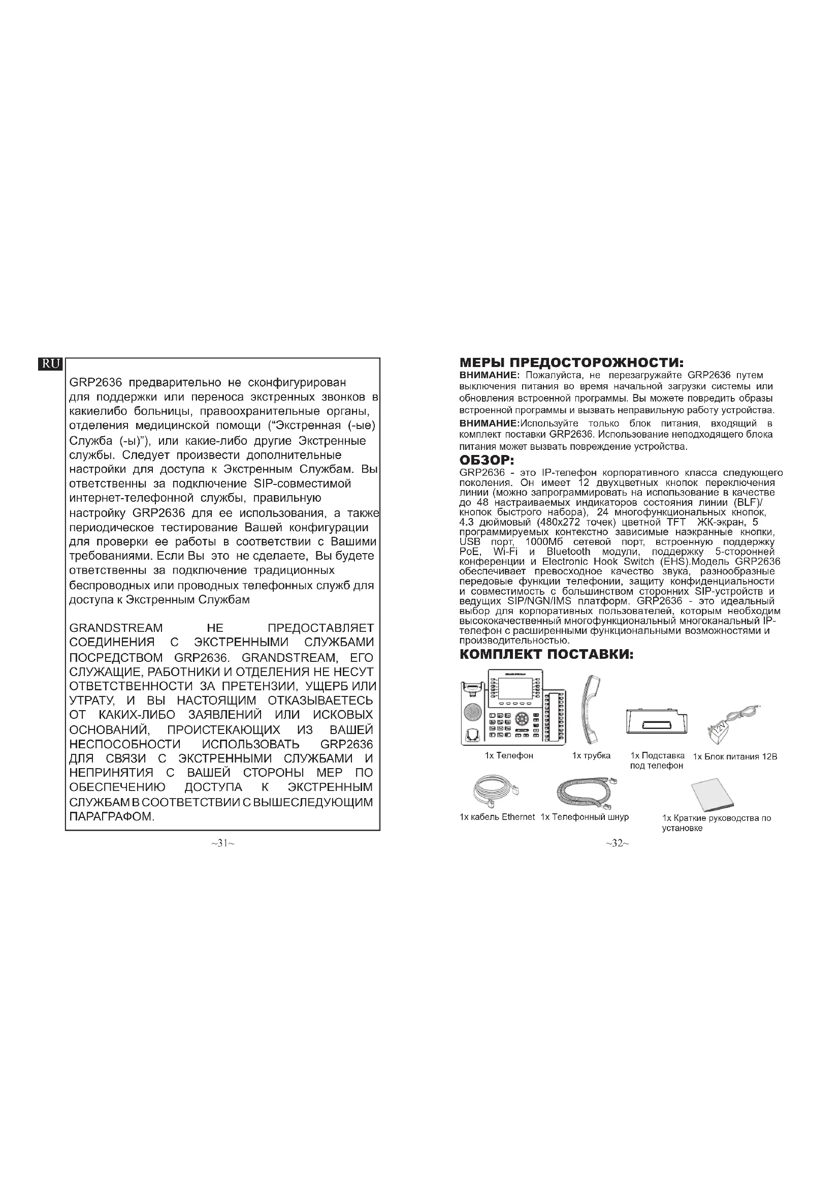 GRP2636 предварительно не сконфигурирован для поддержки или переноса экстренных звонков в какиелибо больницы, правоохранительные органы, отделения медицинской помощи (“Экстренная (-ые) Служба (-ы)”), или какие-либо другие Экстренные службы. Следует произвести дополнительные настройки для доступа к Экстренным Службам. Вы ответственны за подключение SIP-совместимой интернет-телефонной службы, правильную настройку GRP2636 для ее использования, а также периодическое тестирование Вашей конфигурации для проверки ее работы в соответствии с Вашими требованиями. Если Вы это не сделаете, Вы будете ответственны за подключение традиционных беспроводных или проводных телефонных служб для доступа к Экстренным Службам GRANDSTREAM НЕ ПРЕДОСТАВЛЯЕТ СОЕДИНЕНИЯ С ЭКСТРЕННЫМИ СЛУЖБАМИ ПОСРЕДСТВОМ GRP2636. GRANDSTREAM, ЕГО СЛУЖАЩИЕ, РАБОТНИКИ И ОТДЕЛЕНИЯ НЕ НЕСУТ ОТВЕТСТВЕННОСТИ ЗА ПРЕТЕНЗИИ, УЩЕРБ ИЛИ УТРАТУ, И ВЫ НАСТОЯЩИМ ОТКАЗЫВАЕТЕСЬ ОТ КАКИХ-ЛИБО ЗАЯВЛЕНИЙ ИЛИ ИСКОВЫХ ОСНОВАНИЙ, ПРОИСТЕКАЮЩИХ ИЗ ВАШЕЙ НЕСПОСОБНОСТИ ИСПОЛЬЗОВАТЬ GRP2636 ДЛЯ СВЯЗИ С ЭКСТРЕННЫМИ СЛУЖБАМИ И НЕПРИНЯТИЯ С ВАШЕЙ СТОРОНЫ МЕР ПО ОБЕСПЕЧЕНИЮ ДОСТУПА К ЭКСТРЕННЫМ СЛУЖБАМ В СООТВЕТСТВИИ С ВЫШЕСЛЕДУЮЩИМ ПАРАГРАФОМ. GRP2636 - это IP-телефон корпоративного класса следующего поколения. Он имеет 12 двухцветных кнопок переключения линии (можно запрограммировать на использование в качестве до 48 настраиваемых индикаторов состояния линии (BLF)/ кнопок быстрого набора), 24 многофункциональных кнопок,
