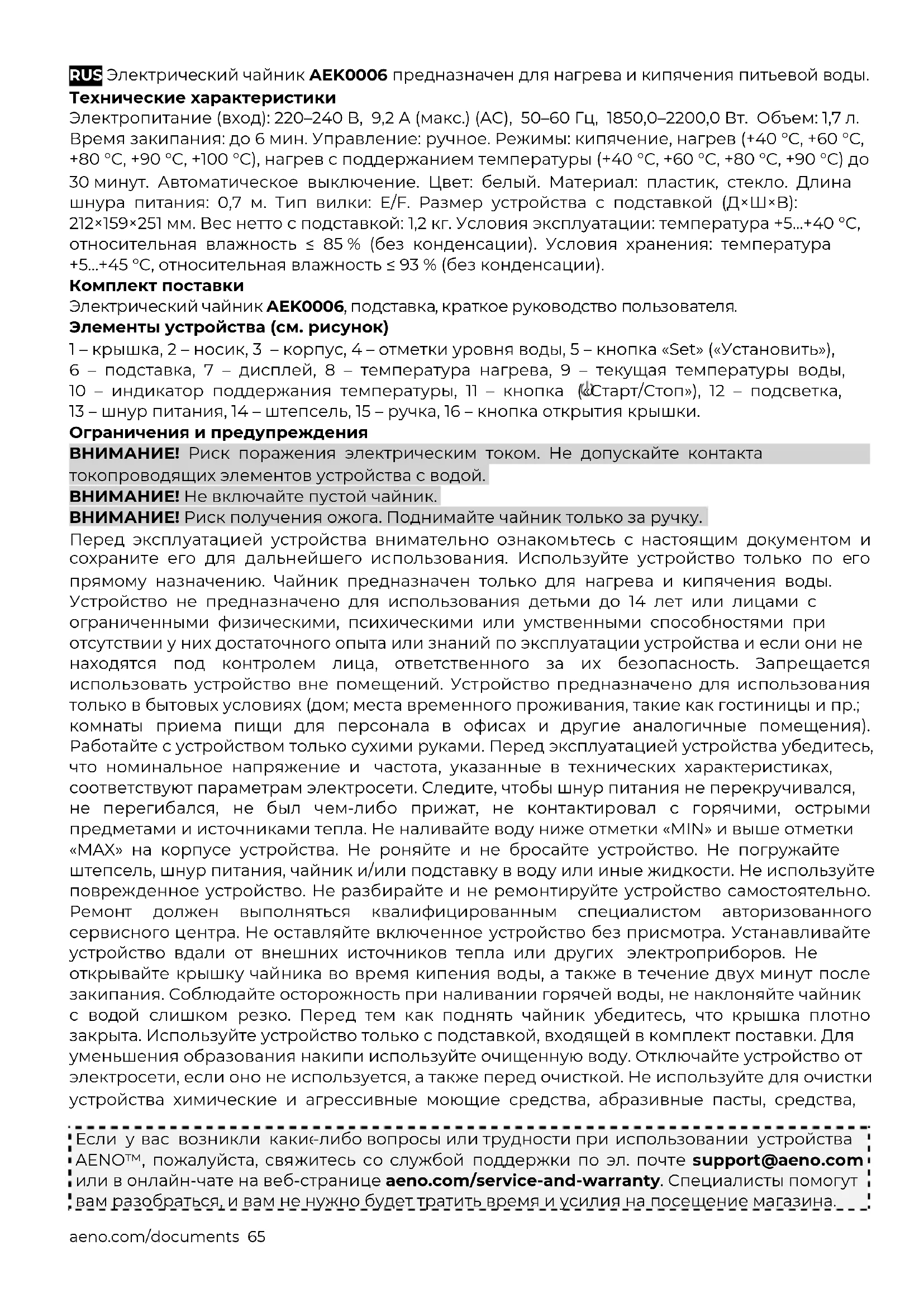 Compania ASBISC își rezervă dreptul de a modifica dispozitivul și de a aduce modificări și adăugiri la acest document fără a anunța în prealabil utilizatorii. Acest dispozitiv este conform cu cerințele de siguranță aplicabile. Perioada de garanție și durata de viață a serviciului – 2 ani de la data vânzării cu amănuntul a produsului. Informații despre producător: ASBISC Enterprises PLC, Iapetou, 1, Agios Athanasios, 4101, Limassol, Cyprus (Cipru). Tel.: +48732080077, e-mail: info@asbis.com, asbis.com. Fabricate în China. Vezi ambalajul pentru data de fabricație. Toate mărcile comerciale și mărcile de produse menționate în acest document sunt proprietatea proprietarilor respectivi. Informații actualizate și o descriere detaliată a dispozitivului, precum și instrucțiuni de conectare, certificate, informații despre companiile care acceptă revendicări și garanții de calitate, sunt disponibile pentru descărcare la link-ul aeno.com/documents. Directiva RoHS. Dispozitivul îndeplinește cerințele Directivei RoHS 2011/65/EU privind restricționarea substanțelor periculoase, inclusiv cerințele Directivei RoHS 2015/863/EU.aeno.com/documents 65 RUS Электрический чайник AEK0006 предназначен для нагрева и кипячения питьевой воды. Технические характеристики Электропитание (вход): 220–240 В, 9,2 А (макс.) (AC), 50–60 Гц, 1850,0–2200,0 Вт. Объем: 1,7 л. Время закипания: до 6 мин. Управление: ручное. Режимы: кипячение, нагрев (+40 °С, +60 °С, +80 °C, +90 °C, +100 °C), нагрев с поддержанием температуры (+40 °С, +60 °С, +80 °C, +90 °C) до 30 минут. Автоматическое выключение. Цвет: белый. Материал: пластик, стекло. Длина шнура питания: 0,7 м. Тип вилки: E/F. Размер устройства с подставкой (Д×Ш×В): 212×159×251 мм. Вес нетто с подставкой: 1,2 кг. Условия эксплуатации: температура +5…+40 °C, относительная влажность ≤ 85 % (без конденсации). Условия хранения: температура +5…+45 °C, относительная влажность ≤ 93 % (без конденсации). Комплект поставки Электрический чайник AEK0006, подставка, краткое руководство пользователя. Элементы устройства (см. рисунок) 1 – крышка, 2 – носик, 3 – корпус, 4 – отметки уровня воды, 5 – кнопка «Set» («Установить»), 6 – подставка, 7 – дисплей, 8 – температура нагрева, 9 – текущая температуры воды, 10 – индикатор поддержания температуры, 11 – кнопка («Старт/Стоп»), 12 – подсветка, 13 – шнур питания, 14 – штепсель, 15 – ручка, 16 – кнопка открытия крышки. Ограничения и предупреждения ВНИМАНИЕ! Риск поражения электрическим током. Не допускайте контакта токопроводящих элементов устройства с водой. ВНИМАНИЕ! Не включайте пустой чайник. ВНИМАНИЕ! Риск получения ожога. Поднимайте чайник только за ручку. Перед эксплуатацией устройства внимательно ознакомьтесь с настоящим документом и сохраните его для дальнейшего использования. Используйте устройство только по его прямому назначению. Чайник предназначен только для нагрева и кипячения воды. Устройство не предназначено для использования детьми до 14 лет или лицами с ограниченными физическими, психическими или умственными способностями при отсутствии у них достаточного опыта или знаний по эксплуатации устройства и если они не находятся под контролем лица, ответственного за их безопасность. Запрещается использовать устройство вне помещений. Устройство предназначено для использования только в бытовых условиях (дом; места временного проживания, такие как гостиницы и пр.; комнаты приема пищи для персонала в офисах и другие аналогичные помещения). Работайте с устройством только сухими руками. Перед эксплуатацией устройства убедитесь, что номинальное напряжение и частота, указанные в технических характеристиках, соответствуют параметрам электросети. Следите, чтобы шнур питания не перекручивался, не перегибался, не был чем-либо прижат, не контактировал с горячими, острыми предметами и источниками тепла. Не наливайте воду ниже отметки «MIN» и выше отметк