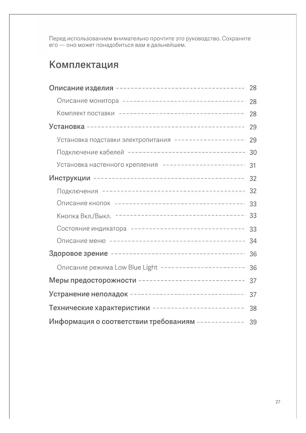 Здоровое зрение Описание режима Low Blue Light Технические характеристики Информация о соответствии требованиям Перед использованием внимательно прочтите это руководство. Сохраните его— оно может понадобиться вам в дальнейшем.28 Функциональная кнопка