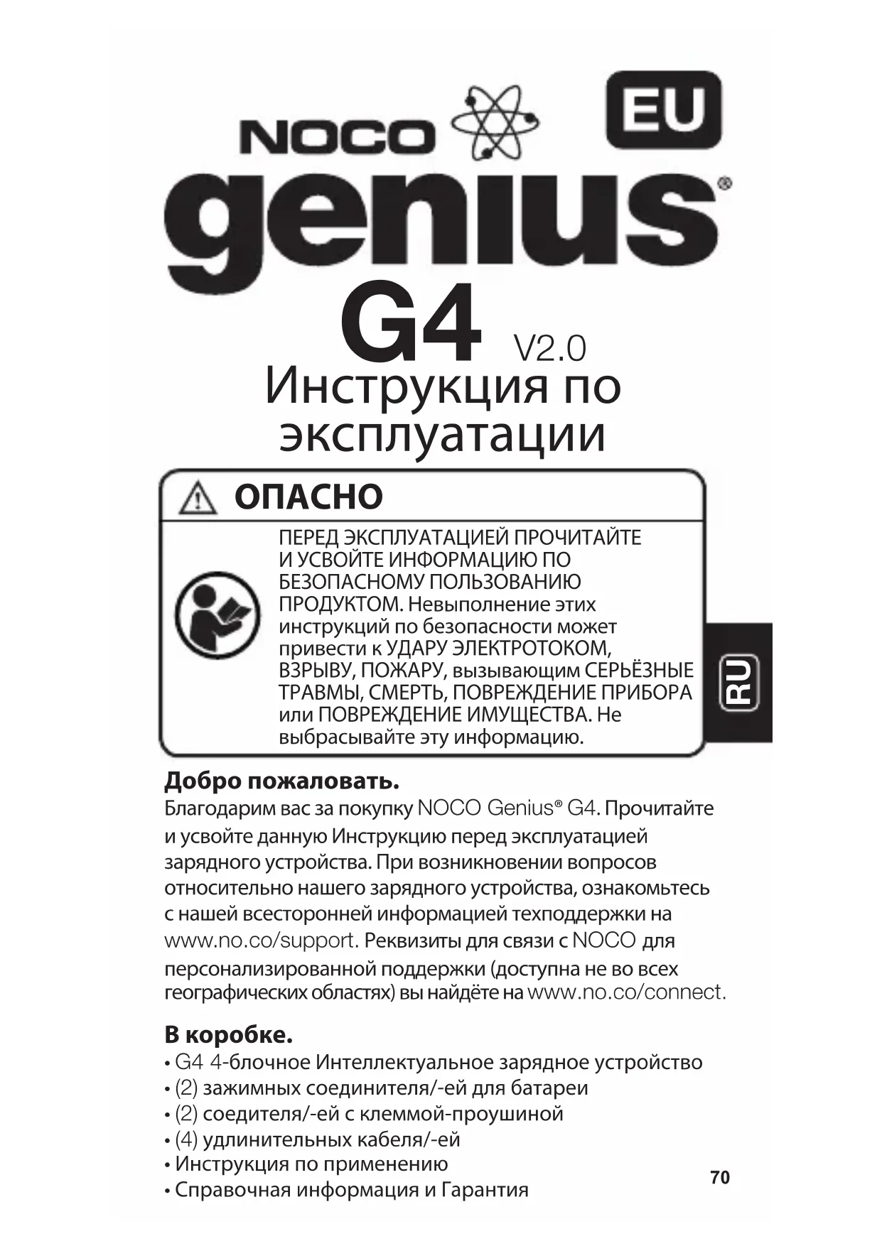 Добро пожаловать. Благодарим вас за покупку NOCO Genius® G4. Прочитайте и усвойте данную Инструкцию перед эксплуатацией зарядного устройства. При возникновении вопросов относительно нашего зарядного устройства, ознакомьтесь с нашей всесторонней информацией техподдержки на www.no.co/support. Реквизиты для связи с NOCO для персонализированной поддержки (доступна не во всех географических областях) вы найдёте на www.no.co/connect.