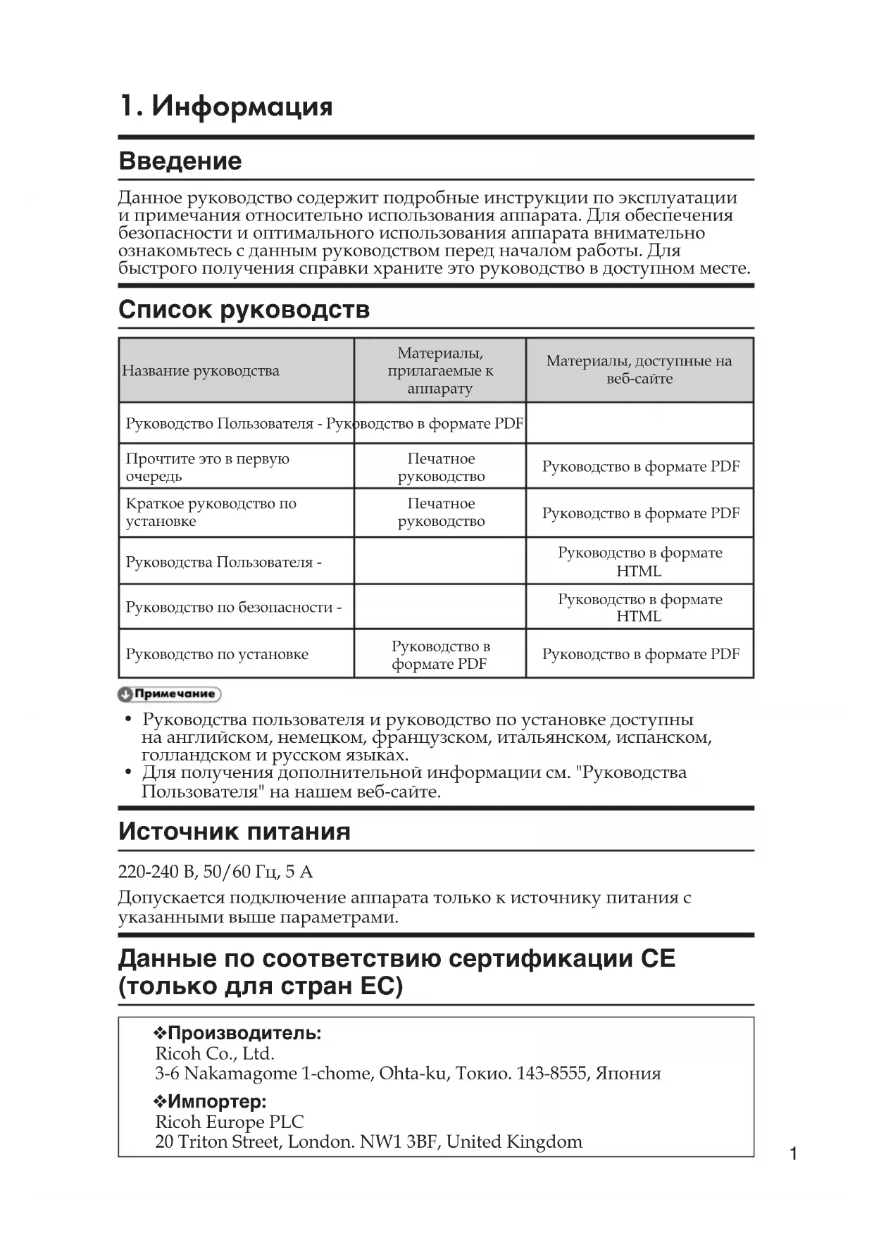 - Для получения дополнительной информации см. "Руководства Пользователя" на нашем веб-сайте. Источник питания 220-240 В, 50/60 Гц, 5 А Допускается подключение аппарата только к источнику питания с указанными выше параметрами. Данные по соответствию сертификации CE (только для стран ЕС) ❖ Производитель: Ricoh Co., Ltd. 3-6 Nakamagome 1-chome, Ohta-ku, Токио. 143-8555, Япония ❖ Импортер: Ricoh Europe PLC 20 Triton Street, London. NW1 3BF, United Kingdom2 Отказ от ответственности В рамках действующего законодательства компания-производитель ни при каких обстоятельствах не несет ответственность за ущерб, возникший в результате поломки изделия, потери зарегистрированных данных, использования или неиспользования данного продукта и руководств пользователя, поставляемых с ним. Всегда выполняйте резервные копии данных, зарегистрированных на данном аппарате. Документы и данные могут стереться при операционных ошибках и сбоях в работе аппарата. Компания-производитель ни при каких обстоятельствах не несет ответственность за документы, созданные при использовании данного аппарата, или за результаты с данных, оформленных вами.
