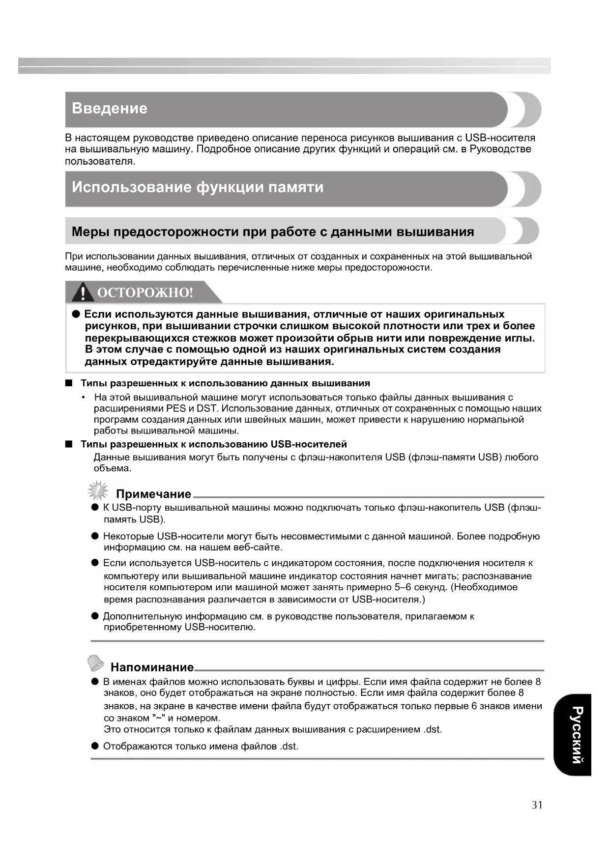 z К USB-порту вышивальной машины можно подключать только флэш-накопитель USB (флэш- память USB). z Некоторые USB-носители могут быть несовместимыми с данной машиной. Более подробную информацию см. на нашем веб-сайте. z Если используется USB-носитель с индикатором состояния, после подключения носителя к компьютеру или вышивальной машине индикатор состояния начнет мигать; распознавание носителя компьютером или машиной может занять примерно 5–6 секунд. (Необходимое время распознавания различается в зависимости от USB-носителя.) z Дополнительную информацию см. в руководстве пользователя, прилагаемом к приобретенному USB-носителю. Напоминание z В именах файлов можно использовать буквы и цифры. Если имя файла содержит не более 8 знаков, оно будет отображаться на экране полностью. Если имя файла содержит более 8 знаков, на экране в качестве имени файла будут отображаться только первые 6 знаков имени со знаком "~" и номером. Это относится только к файлам данных вышивания с расширением .dst. z Отображаются только имена файлов .dst. ● Если используются данные вышивания, отличные от наших оригинальных рисунков, при вышивании строчки слишком высокой плотности или трех и более перекрывающихся стежков может произойти обрыв нити или повреждение иглы. В этом случае с помощью одной из наших оригинальных систем создания данных отредактируйте данные вышивания.32 — — — — — — — — — — — — — — — — — — — — — — — — — — — — — — — — — — — — — — — — — — — — — — — — — — — ■ Меры предосторожности при создании и сохранении данных на компьютере