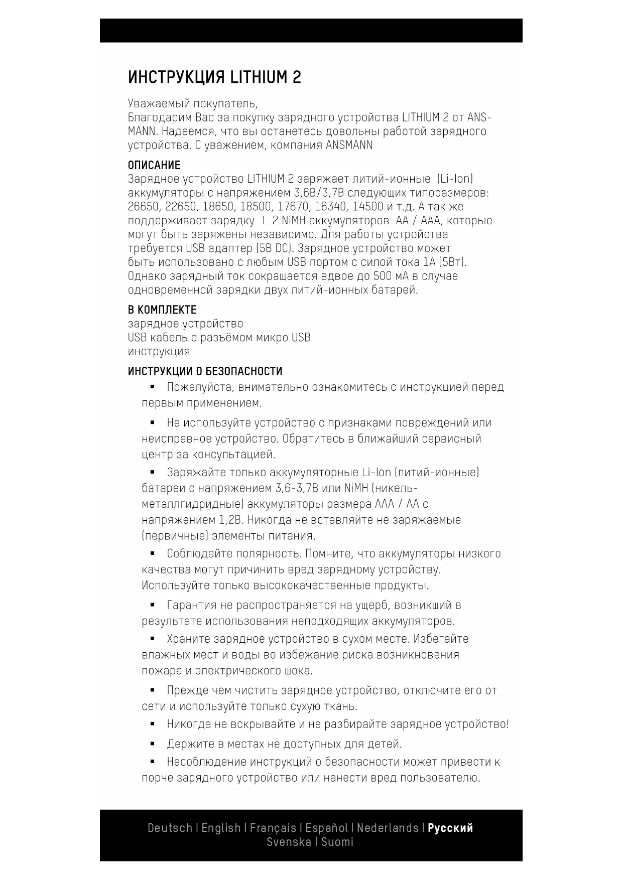 ИНСТРУКЦИИ О БЕЗОПАСНОСТИ Пожалуйста, внимательно ознакомитесь с инструкцией перед первым применением. Не используйте устройство с признаками повреждений или неисправное устройство. Обратитесь в ближайший сервисный центр за консультацией. Заряжайте только аккумуляторные Li-Ion (литий-ионные) батареи с напряжением 3,6-3,7В или NiMH (никель- металлгидридные) аккумуляторы размера ААА / АА с напряжением 1,2В. Никогда не вставляйте не заряжаемые (первичные) элементы питания. Соблюдайте полярность. Помните, что аккумуляторы низкого качества могут причинить вред зарядному устройству. Используйте только высококачественные продукты. Гарантия не распространяется на ущерб, возникший в результате использования неподходящих аккумуляторов. Храните зарядное устройство в сухом месте. Избегайте влажных мест и воды во избежание риска возникновения пожара и электрического шока. Прежде чем чистить зарядное устройство, отключите его от сети и используйте только сухую ткань. Никогда не вскрывайте и не разбирайте зарядное устройство! Держите в местах не доступных для детей. Несоблюдение инструкций о безопасности может привести к порче зарядного устройство или нанести вред пользователю. Deutsch | English | Français | Español | Nederlands | Pусский Svenska | Suomi Отключайте зарядное устройство от сети после его использования. ОБЗОР ФУНКЦИЙ Зарядное устройство для 1-2 Li-Ion аккумуляторов (3.6V/3.7V) 26650, 22650, 18650, 18500, 17670, 16340, 14500 и т.д. или 1-2 NiMH аккумуляторов (1.2V) AA / AAA. Включает микро USB кабель. Индивидуальный мониторинг каждого слота. Автоматическое определение Li-Ion и NiMH аккумуляторов. Зарядка начинается автоматически после обнаружения аккумулятора с верной полярностью. Микропроцессорный контроль (CC-CV для Li-Ion, 0dV/-dV для NiMH). Автоматическое определение уровня заряда и прекращение зарядного процесса. Индикация статуса заряда с помощью трех светодиодов для каждого слота. Обнаружение неверной полярности аккумулятора. Зарядка с помощью 5В DC USB адаптера (в комплект не входит). 3 года гарантии. ЭКСПЛУАТАЦИЯ Для работы устройства, подсоедините микро USB кабель к зарядному устройству и к USB адаптеру с силой тока минимум 1А. После подключения, устройство выполнит быстрый функциональный тест, когда каждый светодиод кратковременно загорается. С данным зарядным устройством Вы можете заряжать 1-2 Li- Ion, 1-2 NiMH аккумуляторы либо 1 Li-Ion и 1 NiMH аккумуляторы одновременно и независимо друг от друга. Для заряда аккумулятора, вставьте его в слот, соблюдая верную полярность, ориентируясь на знаки «+» и «-» на корпусе зарядного устройства. Зарядное устройство, оборудованное микропроцессором, автоматически обнаружит вставленный аккумулятор, его напряжение и выберет подходящую программу заряда. Процесс заряда начнется автоматически и его статус можно отслеживать с помощью трех светодиодов на корпусе устройства, расположенных сверху каждого слота. Нормально, что аккумуляторы нагреваются во время зарядки. После того, как батарея будет полностью заряжена, все три светодиода будут гореть непрерывно. ОБОЗНАЧЕНИЯ СВЕТОДИОДОВ 1 LED мигает: идет процесс заряда, статус заряда < 30% Deutsch | English | Français | Español | Nederlands | Pусский Svenska | Suomi1 LED горит постоянно / 1 LED мигает: идет процесс заряда, статус заряда > 30% / < 60% 2 LED горят постоянно / 1 LED мигает: идет процесс заряда, статус заряда > 60% / < 100% 3 LED горят постоянно: процесс заряда завершен / акку