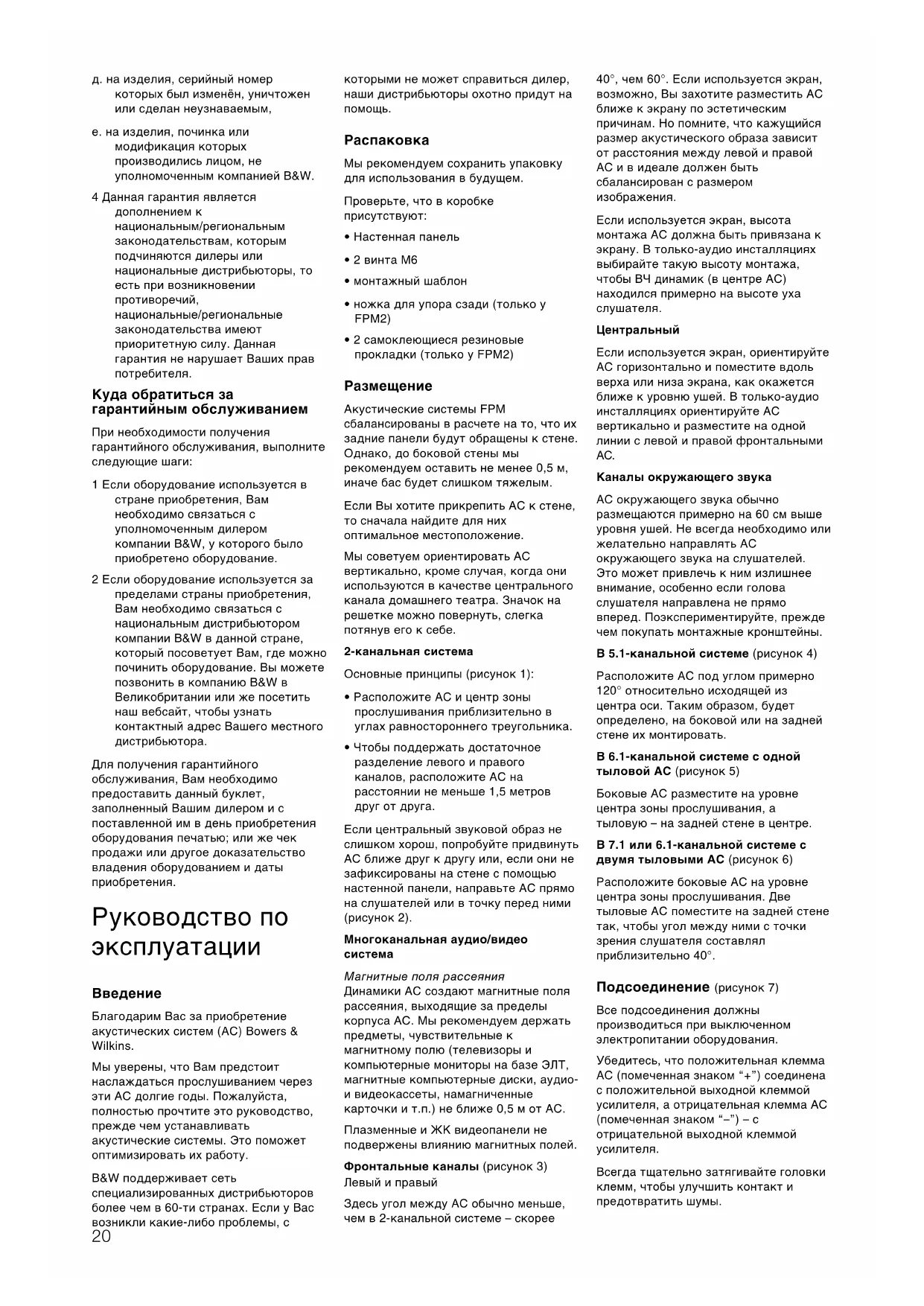 2 Действие данной гарантии распространяется только на первоначального владельца. Гарантия не может быть передана другому лицу. 3 Данная гарантия распространяется только на те неисправности, которые вызваны дефектными материалами и/или дефектами при производстве на момент приобретения и не распространяется: а. на повреждения, вызванные неправильной инсталляцией, подсоединением или упаковкой, б. на повреждения, вызванные использованием, не соответствующим описанному в руководстве по применению, а также неправильным обращением, модифицированием или использованием запасных частей, не произведённых или не одобренных компанией B&W, в. на повреждения, вызванные неисправным или неподходящим вспомогательным оборудованием, г. на повреждения, вызванные несчастными случаями, молнией, водой, пожаром, войной, публичными беспорядками или же любыми другими факторами, не подпадающими под контроль компании B&W и её официальных дистрибьюторов, 19д. на изделия, серийный номер которых был изменён, уничтожен или сделан неузнаваемым, е. на изделия, починка или модификация которых производились лицом, не уполномоченным компанией B&W. 4 Данная гарантия является дополнением к национальным/региональным законодательствам, которым подчиняются дилеры или национальные дистрибьюторы, то есть при возникновении противоречий, национальные/региональные законодательства имеют приоритетную силу. Данная гарантия не нарушает Ваших прав потребителя. Куда обратиться за гарантийным обслуживанием При необходимости получения гарантийного обслуживания, выполните следующие шаги: 1 Если оборудование используется в стране приобретения, Вам необходимо связаться с уполномоченным дилером компании B&W, у которого было приобретено оборудование. 2 Если оборудование используется за пределами страны приобретения, Вам необходимо связаться с национальным дистрибьютором компании B&W в данной стране, который посоветует Вам, где можно починить оборудование. Вы можете позвонить в компанию B&W в Великобритании или же посетить наш вебсайт, чтобы узнать контактный адрес Вашего местного дистрибьютора. Для получения гарантийного обслуживания, Вам необходимо предоставить данный буклет, заполненный Вашим дилером и с поставленной им в день приобретения оборудования печатью; или же чек продажи или другое доказательство владения оборудованием и даты приобретения. Руководство по эксплуатации