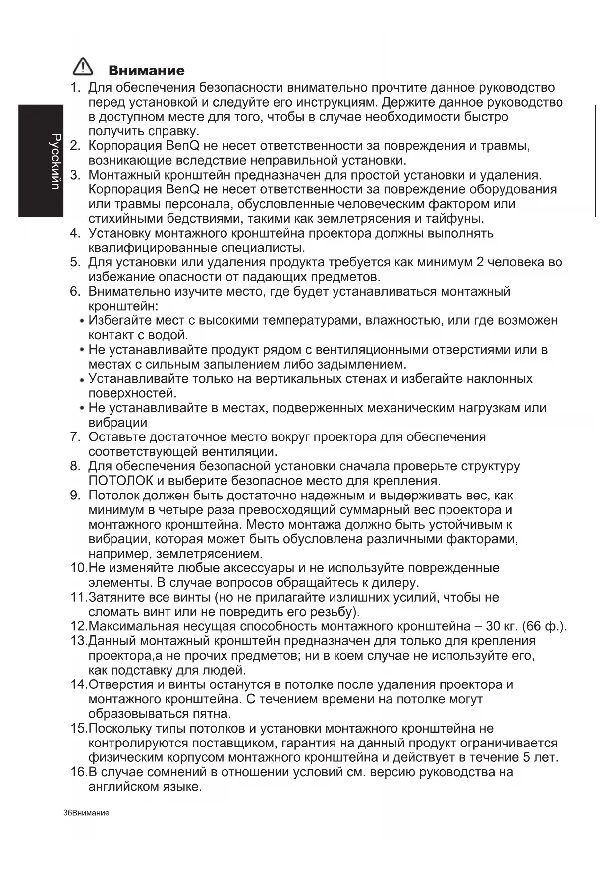 минимум в четыре раза превосходящий суммарный вес проектора и монтажного кронштейна. Место монтажа должно быть устойчивым к вибрации, которая может быть обусловлена различными факторами, например, землетрясением. 10.Не изменяйте любые аксессуары и не используйте поврежденные элементы. В случае вопросов обращайтесь к дилеру. 11.Затяните все винты (но не прилагайте излишних усилий, чтобы не сломать винт или не повредить его резьбу). 12.Максимальная несущая способность монтажного кронштейна – 30 кг. (66 ф.). 13.Данный монтажный кронштейн предназначен для только для крепления проектора,а не прочих предметов; ни в коем случае не используйте его, как подставку для людей. 14.Отверстия и винты останутся в потолке после удаления проектора и монтажного кронштейна. С течением времени на потолке могут образовываться пятна. 15.Поскольку типы потолков и установки монтажного кронштейна не контролируются поставщиком, гарантия на данный продукт ограничивается физическим корпусом монтажного кронштейна и действует в течение 5 лет. 16.В случае сомнений в отношении условий см. версию руководства на английском языке.