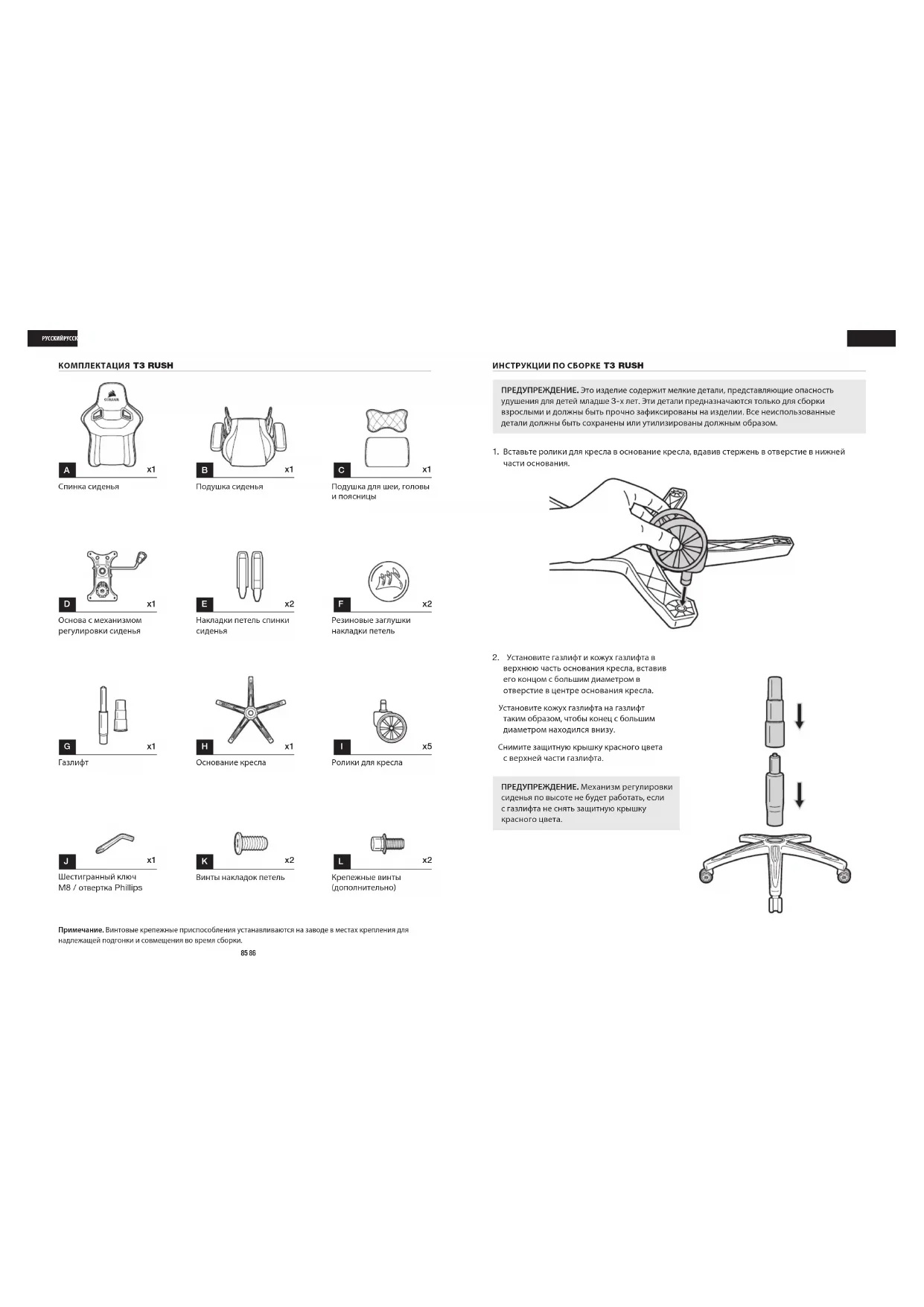 Ролики для кресла Резиновые заглушки накладки петель Крепежные винты (дополнительно) ПРЕДУПРЕЖДЕНИЕ. Это изделие содержит мелкие детали, представляющие опасность удушения для детей младше 3-х лет. Эти детали предназначаются только для сборки взрослыми и должны быть прочно зафиксированы на изделии. Все неиспользованные детали должны быть сохранены или утилизированы должным образом. ПРЕДУПРЕЖДЕНИЕ. Механизм регулировки сиденья по высоте не будет работать, если с газлифта не снять защитную крышку красного цвета. ИНСТРУКЦИИ ПО СБОРКЕ T3RUSH