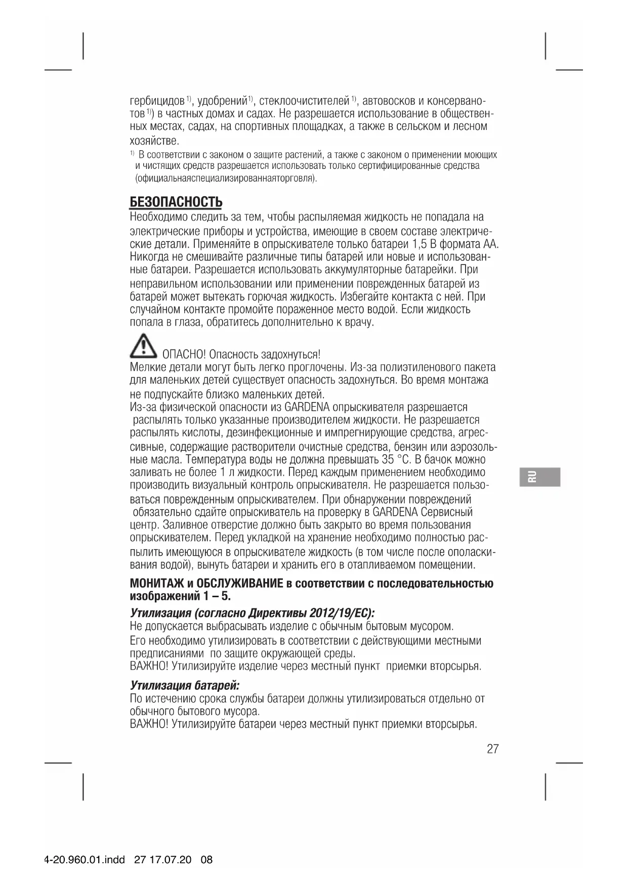 В соответствии с законом о защите растений, а также с законом оприменении моющих и чистящих средств разрешается использовать только сертифицированные средства (официальная специали зированная торговля). БЕЗОПАСНОСТЬ Необходимо следить за тем, чтобы распыляемая жидкость не попадала на электрические приборы и устройства, имеющие в своем составе электриче- ские детали. Применяйте в опрыскивателе только батареи 1,5 В формата AA. Никогда не смешивайте различные типы батарей или новые ииспользован- ные батареи. Разрешается использовать аккумуляторные батарейки. При неправильном использовании или применении поврежденных батарей из батарей может вытекать горючая жидкость. Избегайте контакта сней. При случайном контакте промойте пораженное место водой. Если жидкость попала в глаза, обратитесь дополнительно к врачу. ОПАСНО! Опасность задохнуться! Мелкие детали могут быть легко проглочены. Из-за полиэтиленового пакета для маленьких детей существует опасность задохнуться. Во время монтажа не подпускайте близко маленьких детей. Из-за физической опасности из GARDENA опрыскивателя разрешается распылять только указанные производителем жидкости. Не разрешается распылять кислоты, дезинфекционные и импрегнирующие средства, агрес- сивные, содержащие растворители очистные средства, бензин или аэрозоль- ные масла. Температура воды не должна превышать 35 °C. В бачок можно заливать не более 1 л жидкости. Перед каждым применением необходимо производить визуальный контроль опрыскивателя. Не разрешается пользо- ваться поврежденным опрыскивателем. При обнаружении повреждений обязательно сдайте опрыскиватель на проверку в GARDENA Сервисный центр. Заливное отверстие должно быть закрыто во время пользования опрыскивателем. Перед укладкой на хранение необходимо полностью рас- пылить имеющуюся в опрыскивателе жидкость (в том числе после ополаски- вания водой), вынуть батареи и хранить его в отапливаемом помещении. МОНИТАЖ и ОБСЛУЖИВАНИЕ в соответствии с последовательностью изображений 1 – 5. Утилизация (согласно Директивы 2012/19/ЕС): Не допускается выбрасывать изделие с обычным бытовым мусором. Его необходимо утилизировать в соответствии сдействующими местными предписаниями по защите окружающей среды. ВАЖНО! Утилизируйте изделие через местный пункт приемки вторсырья. Утилизация батарей: По истечению срока службы батареи должны утилизироваться отдельно от обычного бытового мусора. ВАЖНО! Утилизируйте батареи через местный пункт приемки вторсырья. 11114-20.960.01.indd 27 17.07.20 08:26RU