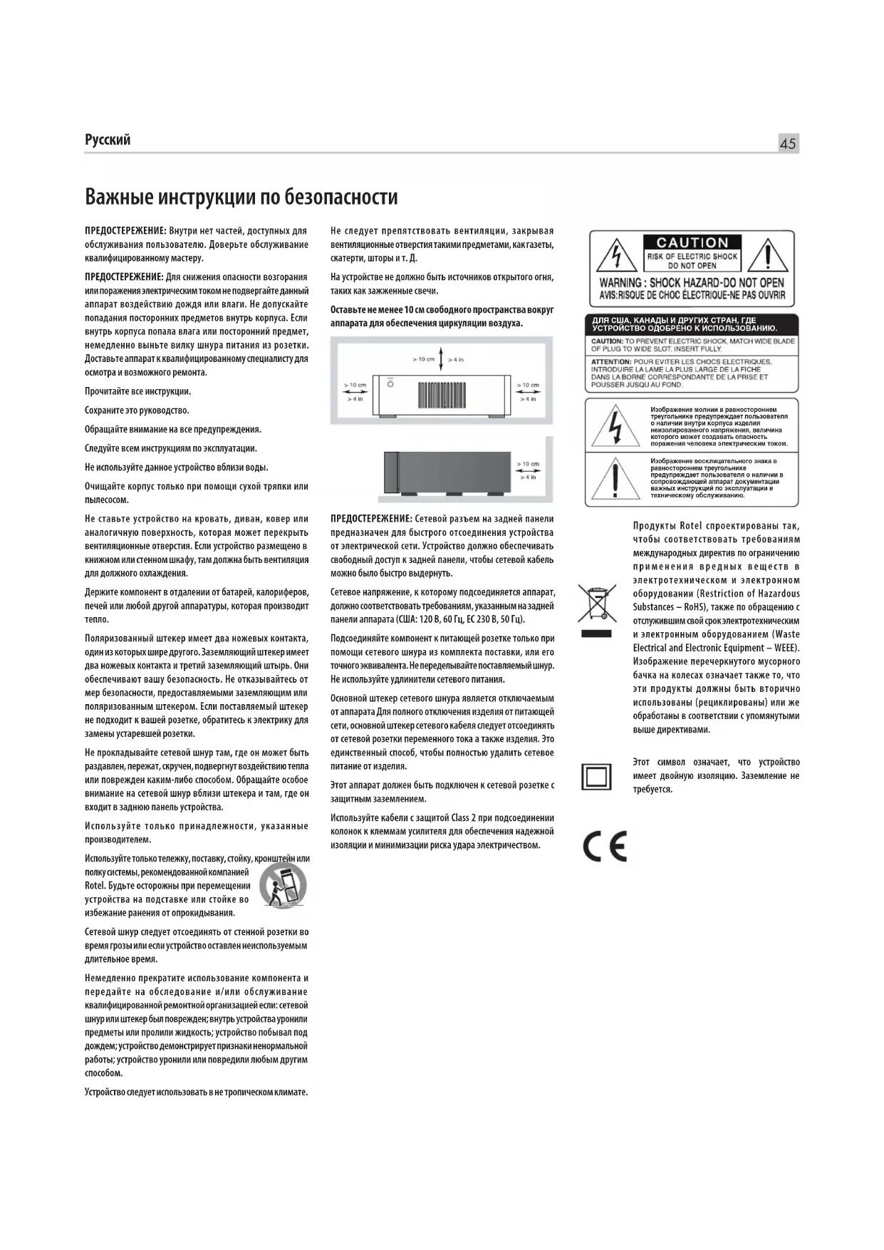 Поляризованный штекер имеет два ножевых контакта, один из которых шире другого. Заземляющий штекер имеет два ножевых контакта и третий заземляющий штырь. Они обеспечивают вашу безопасность. Не отказывайтесь от мер безопасности, предоставляемыми заземляющим или поляризованным штекером. Если поставляемый штекер не подходит к вашей розетке, обратитесь к электрику для замены устаревшей розетки. Не прокладывайте сетевой шнур там, где он может быть раздавлен, пережат, скручен, подвергнут воздействию тепла или поврежден каким-либо способом. Обращайте особое внимание на сетевой шнур вблизи штекера и там, где он входит в заднюю панель устройства. Используйте только принадлежности, указанные производителем. Используйте только тележку, поставку, стойку, кронштейн или полку системы, рекомендованной компанией Rotel. Будьте осторожны при перемещении устройства на подставке или стойке во избежание ранения от опрокидывания. Сетевой шнур следует отсоединять от стенной розетки во время грозы или если устройство оставлен неиспользуемым длительное время. Немедленно прекратите использование компонента и передайте на обследование и/или обслуживание квалифицированной ремонтной организацией если: сетевой шнур или штекер был поврежден; внутрь устройства уронили предметы или пролили жидкость; устройство побывал под дождем; устройство демонстрирует признаки ненормальной работы; устройство уронили или повредили любым другим