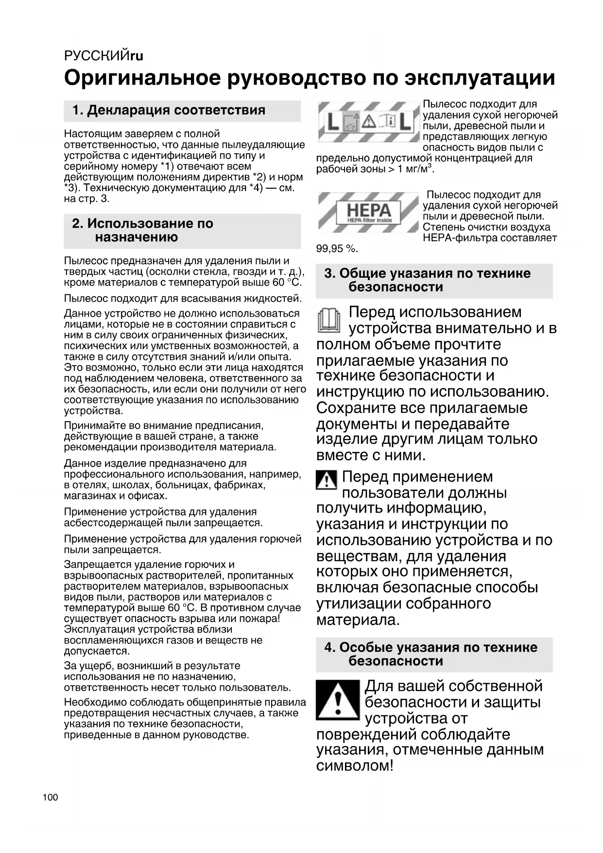 Оригинальное руководство по эксплуатации Настоящим заверяем с полной ответственностью, что данные пылеудаляющие устройства с идентификацией по типу и серийному номеру *1) отвечают всем действующим положениям директив *2) и норм *3). Техническую документацию для *4) — см. на стр. 3. Пылесос предназначен для удаления пыли и твердых частиц (осколки стекла, гвозди и т. д.), кроме материалов с температурой выше 60 °C. Пылесос подходит для всасывания жидкостей. Данное устройство не должно использоваться лицами, которые не в состоянии справиться с ним в силу своих ограниченных физических, психических или умственных возможностей, а также в силу отсутствия знаний и/или опыта. Это возможно, только если эти лица находятся под наблюдением человека, ответственного за их безопасность, или если они получили от него соответствующие указания по использованию устройства. Принимайте во внимание предписания, действующие в вашей стране, а также рекомендации производителя материала. Данное изделие предназначено для профессионального использования, например, в отелях, школах, больницах, фабриках, магазинах и офисах. Применение устройства для удаления асбестсодержащей пыли запрещается. Применение устройства для удаления горючей пыли запрещается. Запрещается удаление горючих и взрывоопасных растворителей, пропитанных растворителем материалов, взрывоопасных видов пыли, растворов или материалов с температурой выше 60 °C. В противном случае существует опасность взрыва или пожара! Эксплуатация устройства вблизи воспламеняющихся газов и веществ не допускается. За ущерб, возникший в результате использования не по назначению, ответственность несет только пользователь. Необходимо соблюдать общепринятые правила предотвращения несчастных случаев, а также указания по технике безопасности, приведенные в данном руководстве. Пылесос подходит для удаления сухой негорючей пыли, древесной пыли и представляющих легкую опасность видов пыли с предельно допустимой концентрацией для рабочей зоны > 1 мг/м³. Пылесос подходит для удаления сухой негорючей пыли и древесной пыли. Степень очистки воздуха HEPA-фильтра составляет 99,95 %. Перед использованием устройства внимательно и в полном объеме прочтите прилагаемые указания по технике безопасности и инструкцию по использованию. Сохраните все прилагаемые документы и передавайте изделие другим лицам только вместе с ними. Перед применением пользователи должны получить информацию, указания и инструкции по использованию устройства и по веществам, для удаления которых оно применяется, включая безопасные способы утилизации собранного