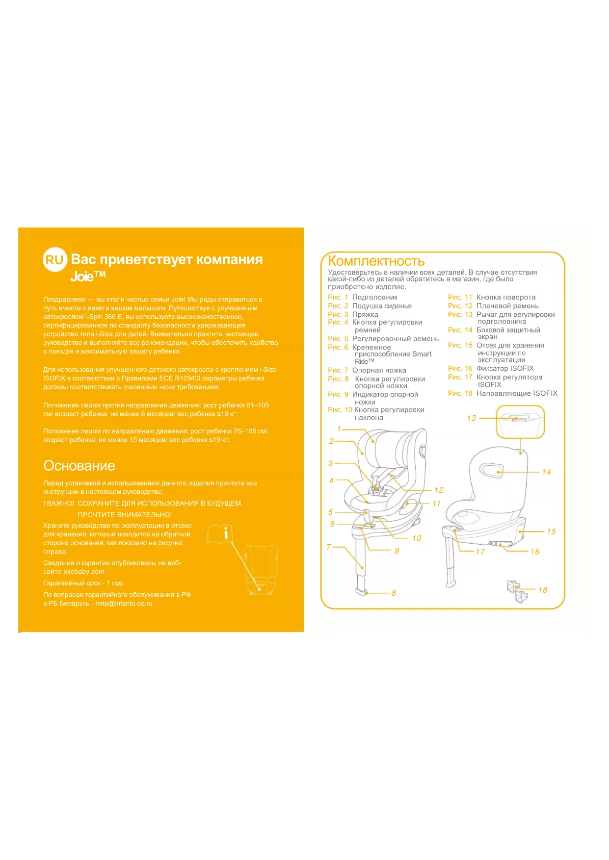Вас приветствует компания Joie™ Поздравляем — вы стали частью семьи Joie! Мы рады отправиться в путь вместе с вами и вашим малышом. Путешествуя с улучшенным автокреслом i-Spin 360 E, вы используете высококачественное, сертифицированное по стандарту безопасности удерживающее устройство типа i-Size для детей. Внимательно прочтите настоящее руководство и выполняйте все рекомендации, чтобы обеспечить удобство в поездке и максимальную защиту ребенка.Для использования улучшенного детского автокресла с креплением i-Size ISOFIX в соответствии с Правилами ECE R129/03 параметры ребенка должны соответствовать указанным ниже требованиям.Положение лицом против направления движения: рост ребенка 61–105 см/ возраст ребенка: не менее 6 месяцев/ вес ребенка ≤19 кг;Положение лицом по направлению движения: рост ребенка 76–105 см/ возраст ребенка: не менее 15 месяцев/ вес ребенка ≤19 кг; Перед установкой и использованием данного изделия прочтите все инструкции в настоящем руководстве.! ВАЖНО! СОХРАНИТЕ ДЛЯ ИСПОЛЬЗОВАНИЯ В БУДУЩЕМ.ПРОЧТИТЕ ВНИМАТЕЛЬНО!Храните руководство по эксплуатации в отсеке для хранения, который находится на обратной стороне основания, как показано на рисунке справа. Сведения о гарантии опубликованы на веб-сайте joiebaby.comГарантийный срок - 1 год.По вопросам гарантийного обслуживания в РФ и РБ Беларусь - help@infanta-co.ru. Комплектность Рис. 1 ПодголовникРис. 2 Подушка сиденьяРис. 3 ПряжкаРис. 4 Кнопка регулировки ремнейРис. 5 Регулировочный ременьРис. 6 Крепежное приспособление Smart Ride™Рис. 7 Опорная ножка Рис. 8 Кнопка регулировки опорной ножкиРис. 9 Индикатор опорной ножкиРис. 10 Кнопка регулировки наклонаРис. 11 Кнопка поворотаРис. 12 Плечевой ременьРис. 13 Рычаг для регулировки подголовникаРис. 14 Боковой защитный экранРис. 15 Отсек для хранения инструкции по эксплуатацииРис. 16 Фиксатор ISOFIXРис. 17 Кнопка регулятора ISOFIXРис. 18 Направляющие ISOFIXУдостоверьтесь в наличии всех деталей. В случае отсутствия какой-либо из деталей обратитесь в магазин, где было приобретено изделие.