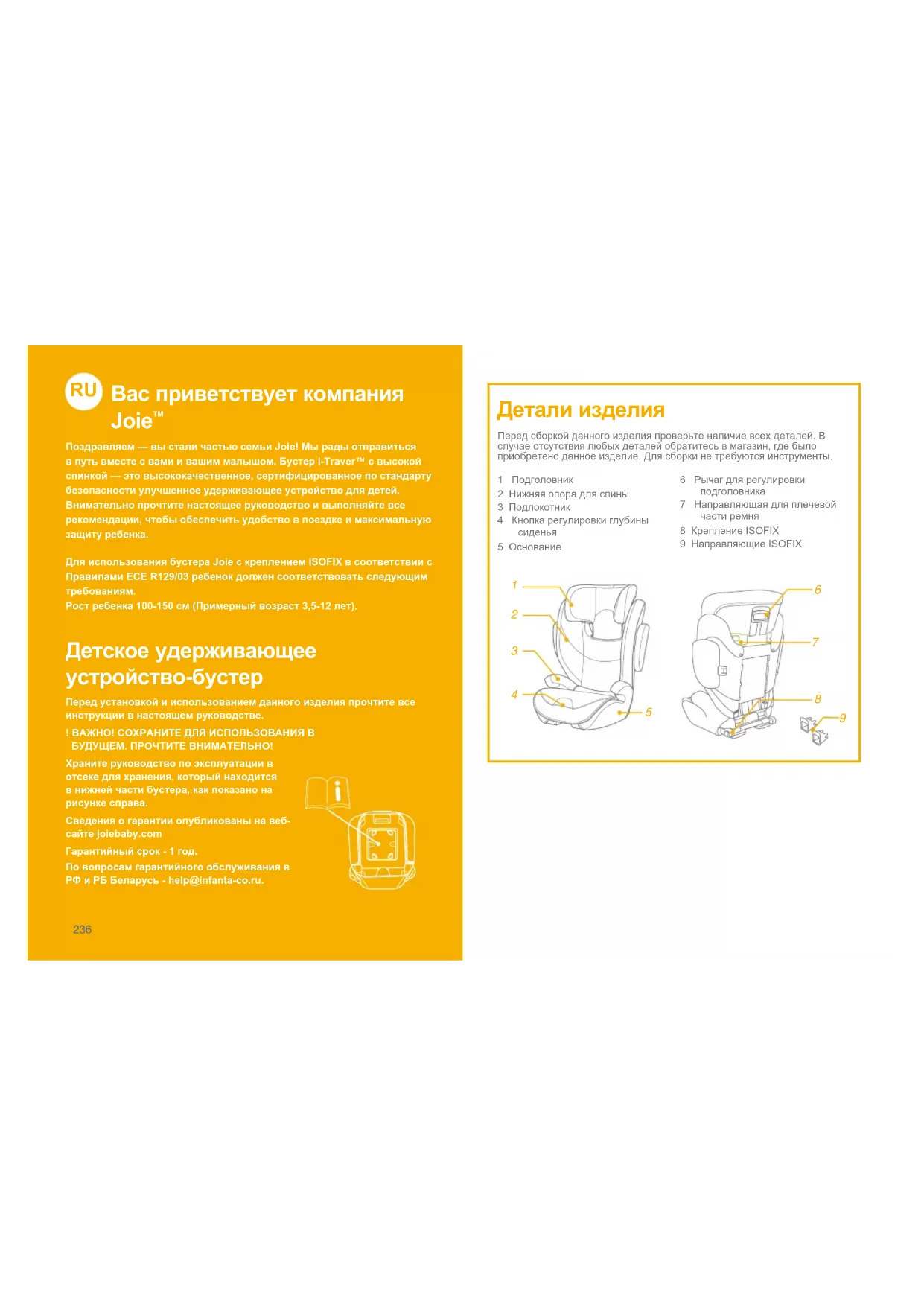 Поздравляем — вы стали частью семьи Joie! Мы рады отправиться в путь вместе с вами и вашим малышом. Бустер i-Traver™ с высокой спинкой — это высококачественное, сертифицированное по стандарту безопасности улучшенное удерживающее устройство для детей. Внимательно прочтите настоящее руководство и выполняйте все рекомендации, чтобы обеспечить удобство в поездке и максимальную защиту ребенка.Для использования бустера Joie с креплением ISOFIX в соответствии с Правилами ECE R129/03 ребенок должен соответствовать следующим требованиям.Рост ребенка 100-150 см (Примерный возраст 3,5-12 лет). Детское удерживающее устройство-бустер Перед установкой и использованием данного изделия прочтите все инструкции в настоящем руководстве.! ВАЖНО! СОХРАНИТЕ ДЛЯ ИСПОЛЬЗОВАНИЯ В БУДУЩЕМ. ПРОЧТИТЕ ВНИМАТЕЛЬНО!Храните руководство по эксплуатации в отсеке для хранения, который находится в нижней части бустера, как показано на рисунке справа.Сведения о гарантии опубликованы на веб-сайте joiebaby.comГарантийный срок - 1 год.По вопросам гарантийного обслуживания в РФ и РБ Беларусь - help@infanta-co.ru.
