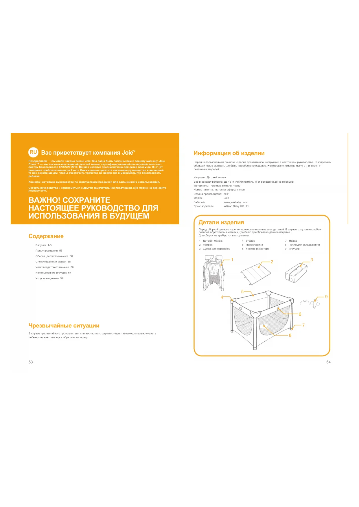 Рисунки 1-3Предупреждения 55Сборка детского манежа 56Сложитедетский манеж 56Упаковкадетского манежа 56Использование игрушек 57Уход за изделием 57 Чрезвычайные ситуации В случае чрезвычайного происшествия или несчастного случая следует незамедлительно оказать ребенку первую помощь и обратиться к врачу. Информация об изделии Перед использованием данного изделия прочтите все инструкции в настоящем руководстве. С вопросами обращайтесь в магазин, где было приобретено изделие. Некоторые элементы могут отличаться у различных моделей.Изделие: Детский манежВес и возраст ребенка: до 15 кг (приблизительно от рождения до 48 месяцев)Материалы: пластик, металл, тканьНомер патента: патенты оформляютсяСтрана производства: КНРМарка: JoieВеб-сайт: www.joiebaby.com Производитель: Allison Baby UK Ltd. Детали изделия Перед сборкой данного изделия проверьте наличие всех деталей. В случае отсутствия любых деталей обратитесь в магазин, где было приобретено данное изделие.Для сборки не требуются инструменты.